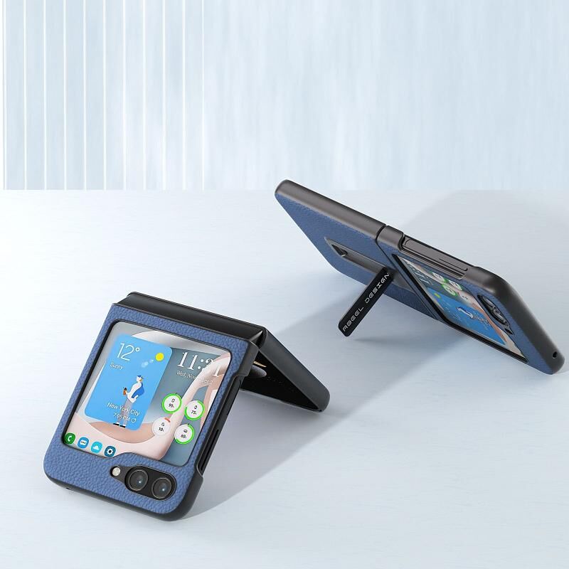 Θήκη τηλεφώνου Samsung Galaxy Z Flip5 ABEEL από γνήσιο δέρμα + PC με υφή λυτσί και βάση στήριξης (Μπλε)