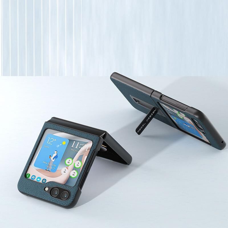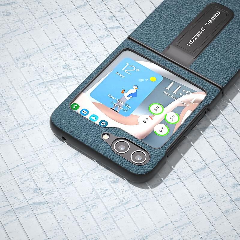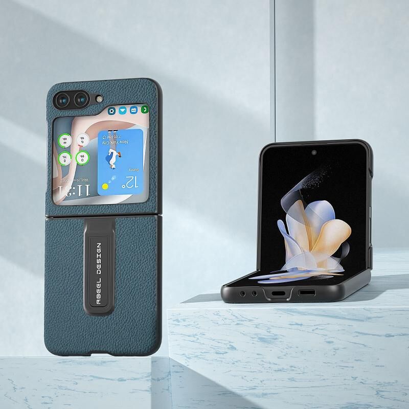 Θήκη τηλεφώνου Samsung Galaxy Z Flip5 ABEEL από γνήσιο δέρμα + PC με υφή λυτσί (Χρυσό Ροζ) με βάση στήριξης.