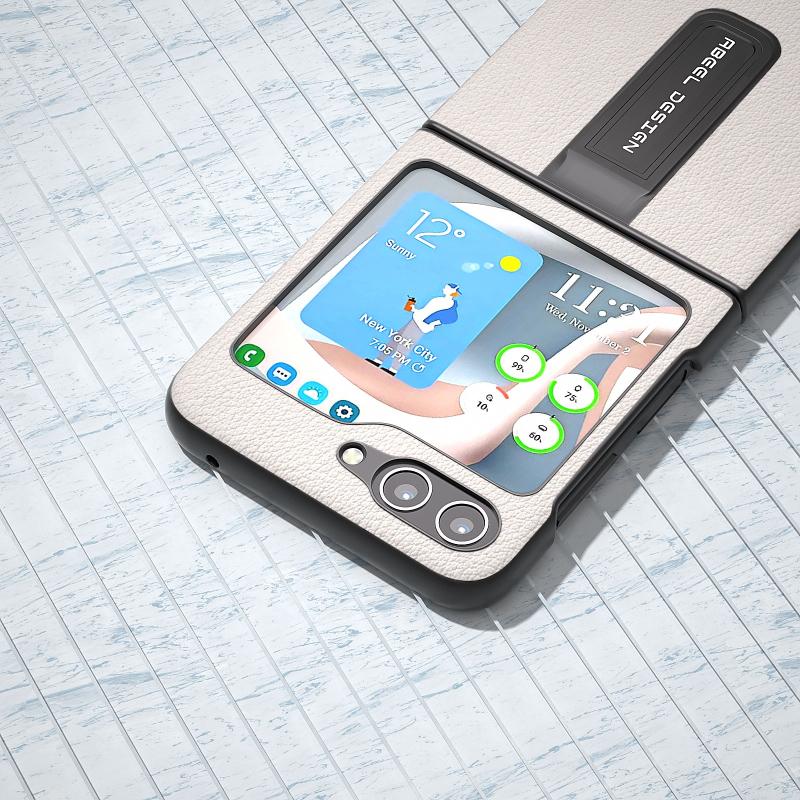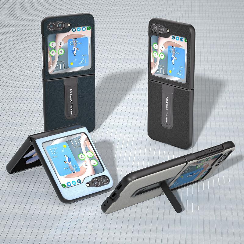 For Samsung Galaxy Z Flip5 ABEEL Genuine Leather Wave Black Edge Phone Case with Holder(Grey)