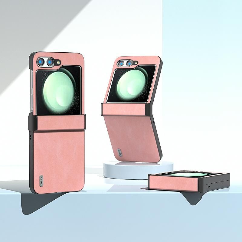 Θήκη τηλεφώνου για Samsung Galaxy Z Flip5 ABEEL, τριών στρώσεων από δέρμα PU, μαύρο περίγραμμα (Ροζ)