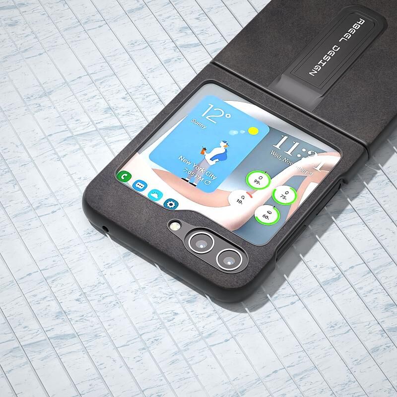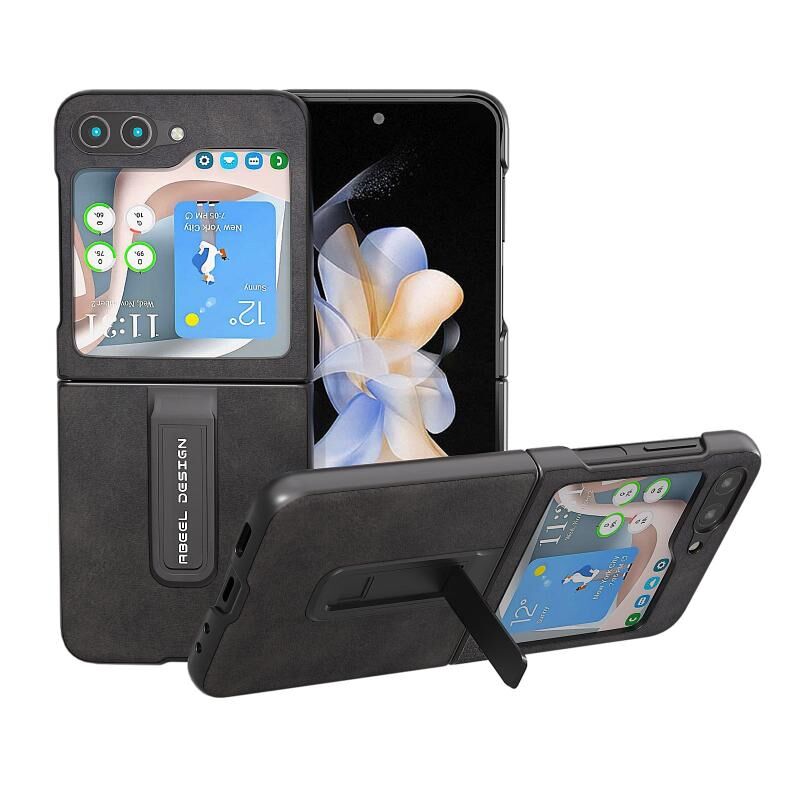 Θήκη τηλεφώνου για Samsung Galaxy Z Flip5 ABEEL, Δερμάτινη υφή δύο χρωμάτων PU με βάση (Μαύρο)
