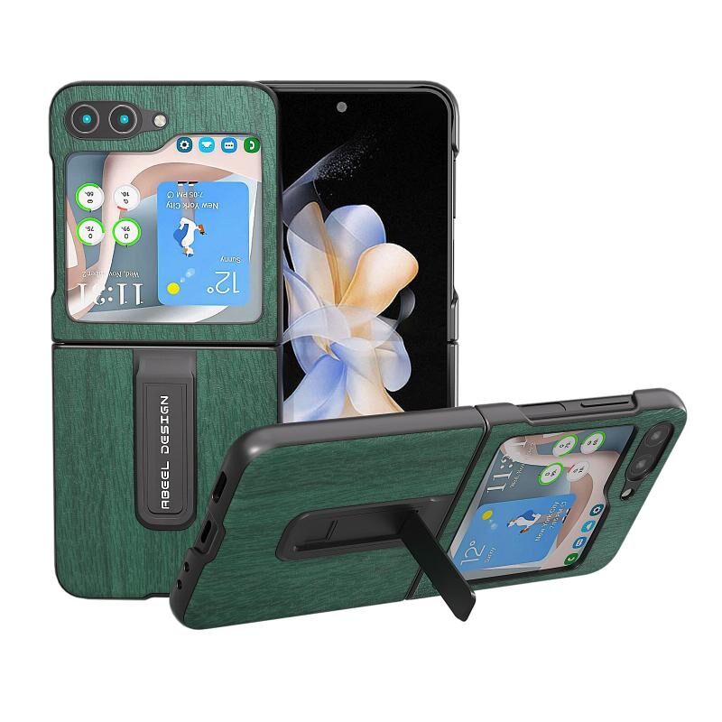 Θήκη κινητού τηλεφώνου Samsung Galaxy Z Flip5 ABEEL με υφή ξύλου από PU με βάση στήριξης (Πράσινο)