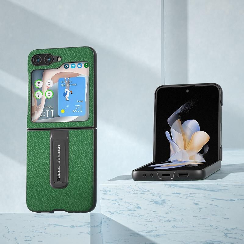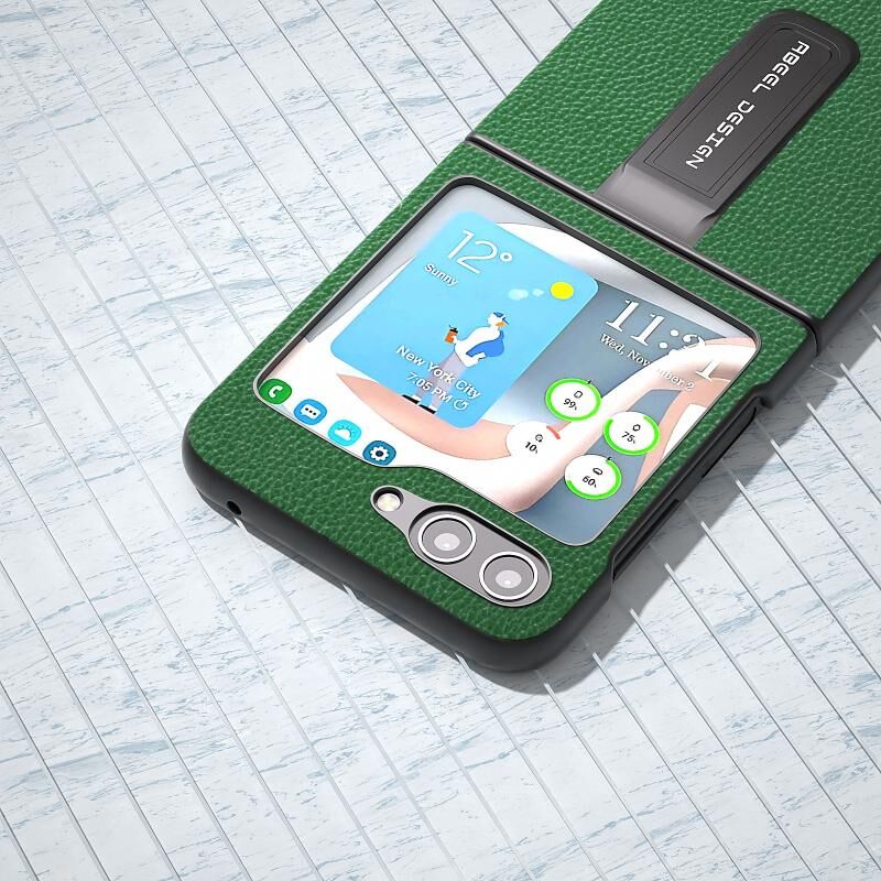 Θήκη τηλεφώνου Mino από γνήσιο δέρμα για Samsung Galaxy Z Flip5 Μαύρο Edge με βάση στήριξης (Πράσινο)