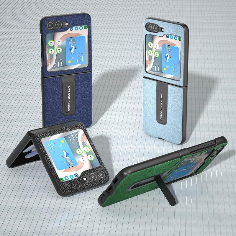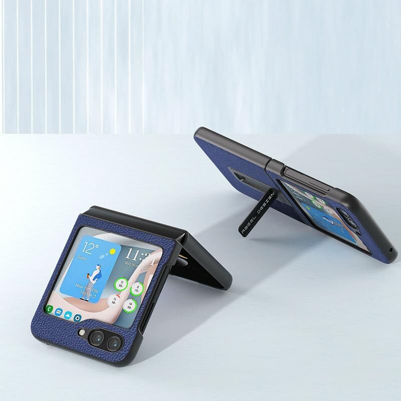 Θήκη τηλεφώνου Mino από γνήσιο δέρμα για Samsung Galaxy Z Flip5 Μαύρο Edge με βάση στήριξης (Βασιλικό Μπλε)