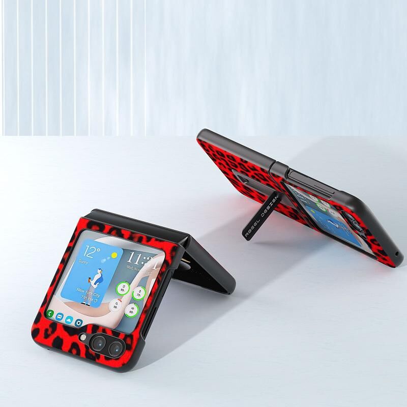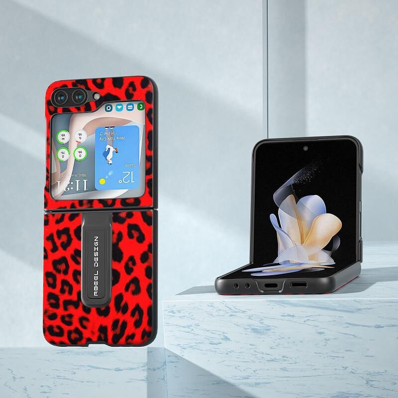 Θήκη κινητού τηλεφώνου Samsung Galaxy Z Flip5 Μαύρο με λεπτομέρειες λεοπάρδαλης και στήριξη (Κόκκινο)