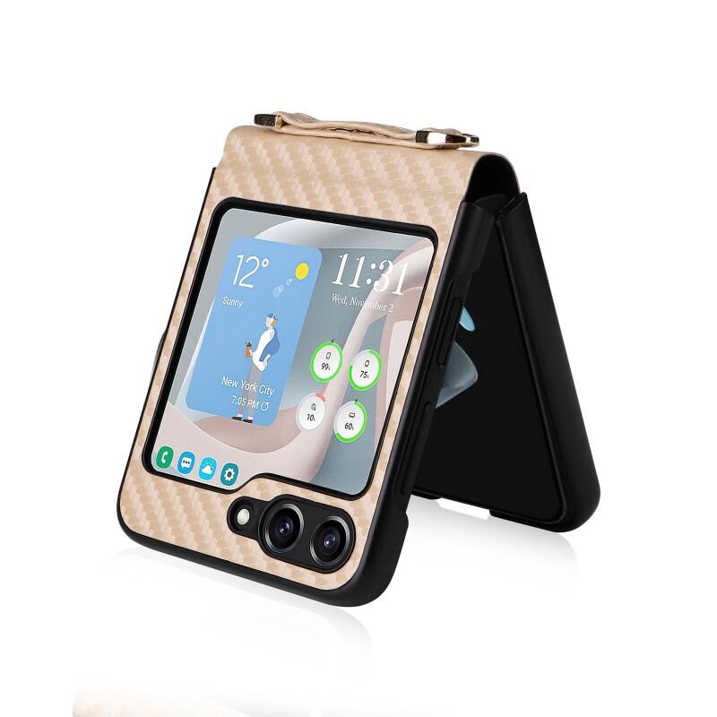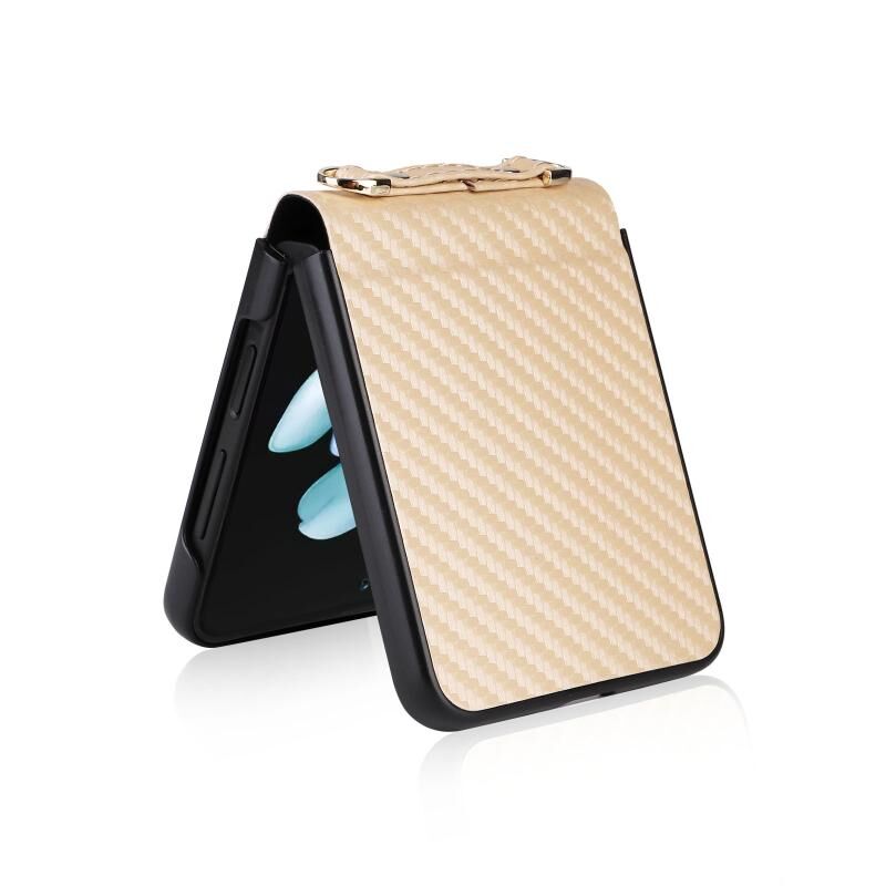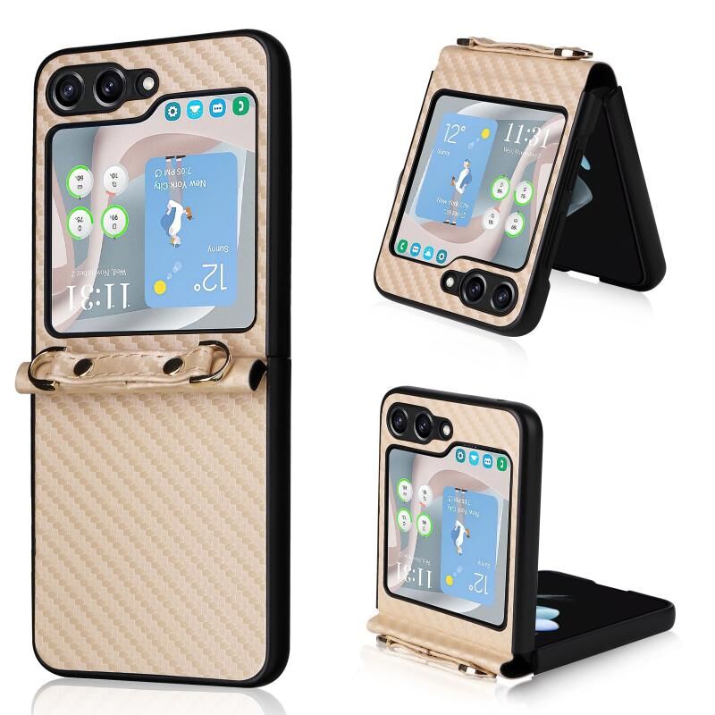 For Samsung Galaxy Z Flip5 Carbon Fiber Texture Phone Case with Lanyard(Gold)