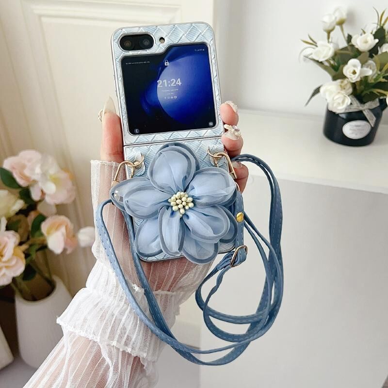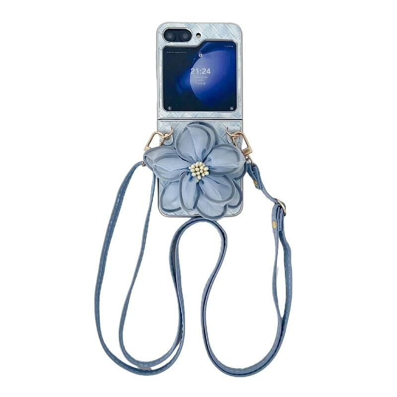 Για Samsung Galaxy Z Flip5 Πολύχρωμο υφαντά μοτίβο 3D νήματα λουλούδι τηλέφωνο υπόθεση με κορδόνι (μπλε)