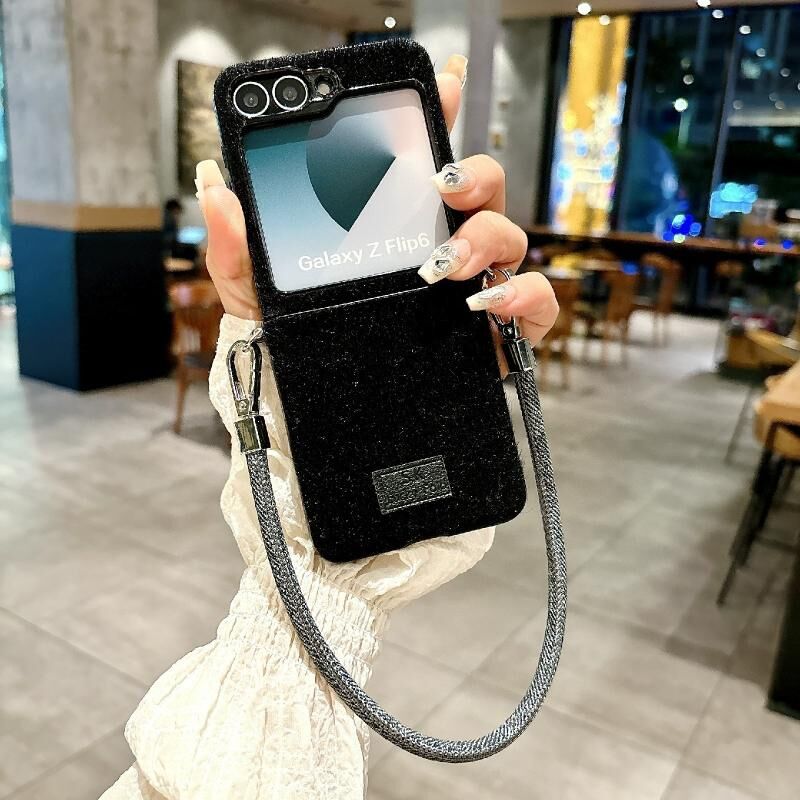 Για Samsung Galaxy Z Flip5 Άνετη σύντομη βελούδινη θήκη τηλεφώνου πλήρους κάλυψης με λουράκι καρπού (μαύρο)