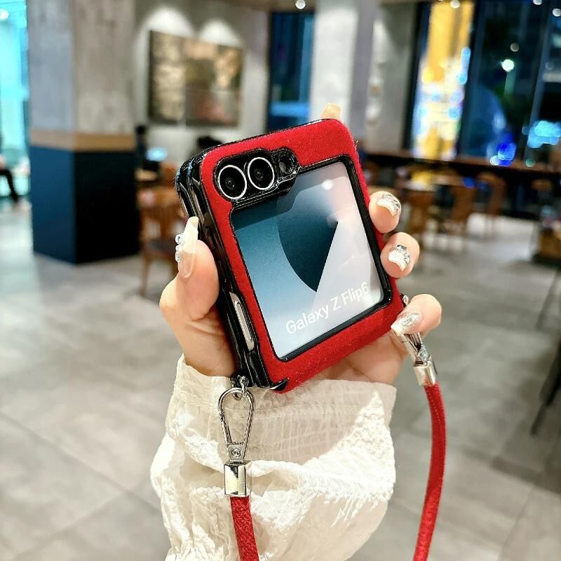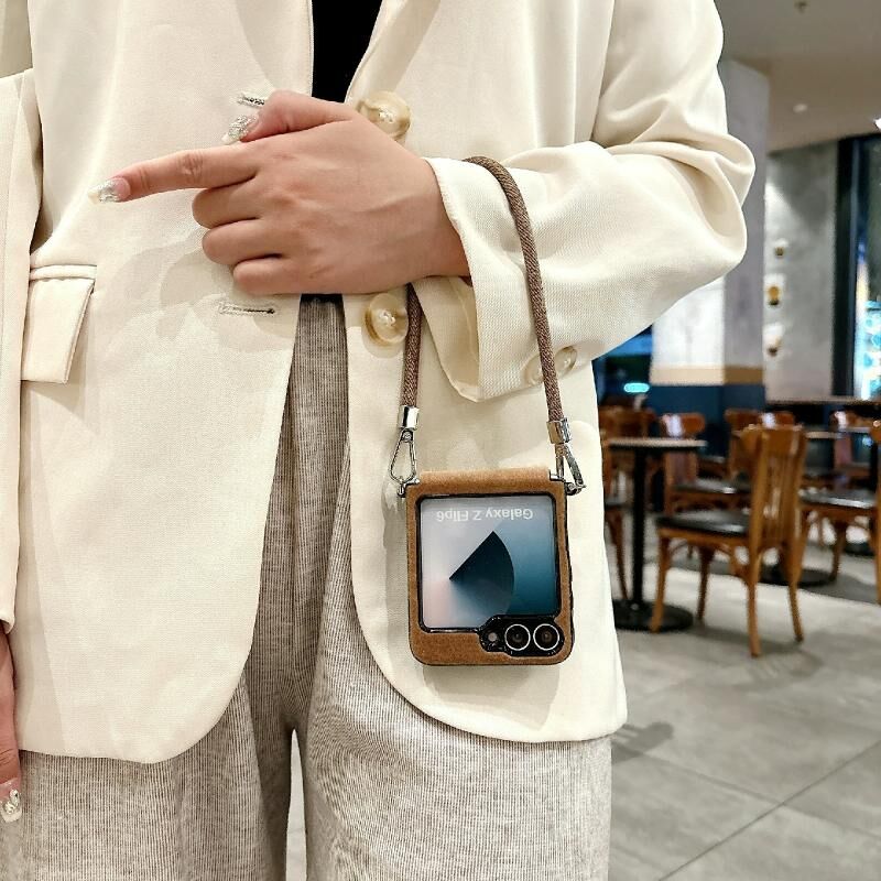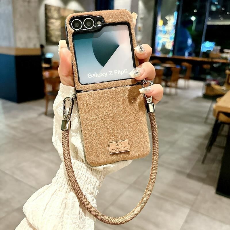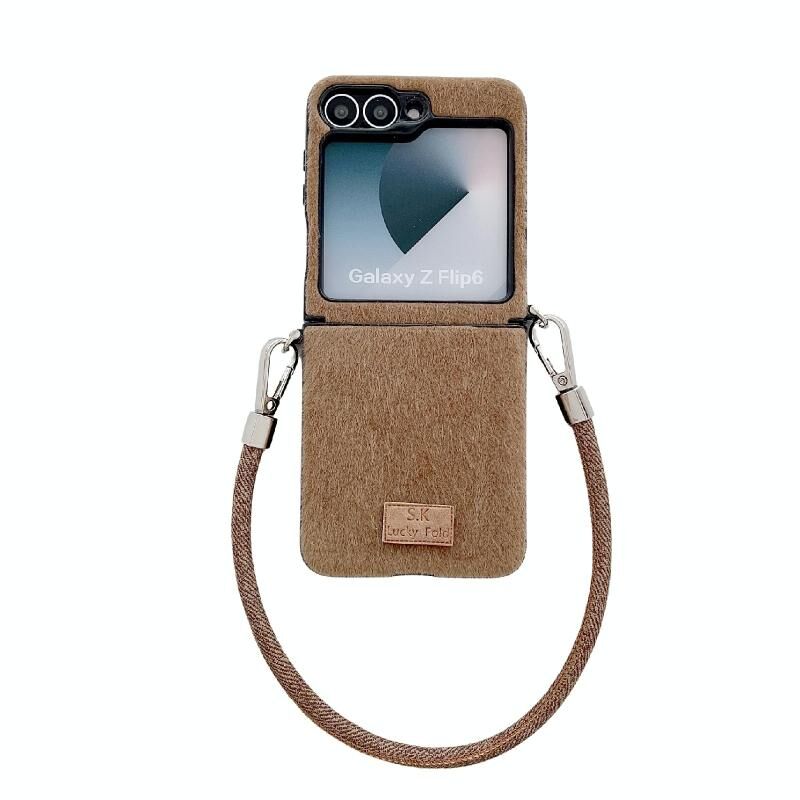 Για Samsung Galaxy Z Flip5 Άνετη σύντομη βελούδινη θήκη τηλεφώνου πλήρους κάλυψης με λουράκι καρπού (καφέ)