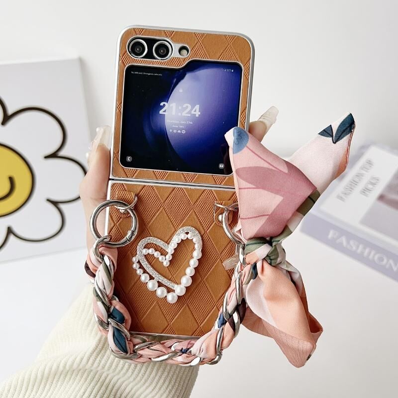 Για Samsung Galaxy Z Flip5 Diamond Square 3D καρδιά μοτίβο πλήρη κάλυψη υπόθεση τηλεφώνου με κασκόλ / βραχιόλι (καφέ)