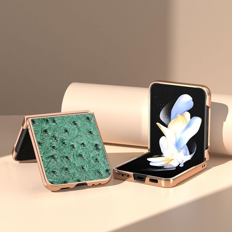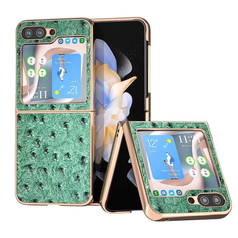 Θήκη τηλεφώνου Samsung Galaxy Z Flip5 από γνήσιο δέρμα με υφή στρουθοκάμπου, σειρά νανο-επίστρωσης (Πράσινο)