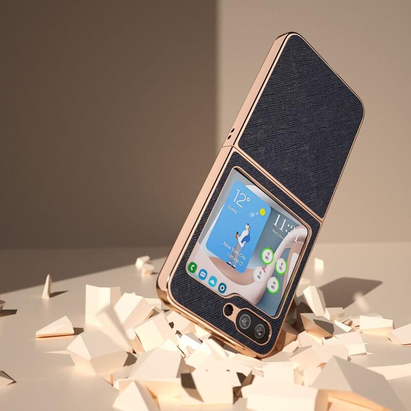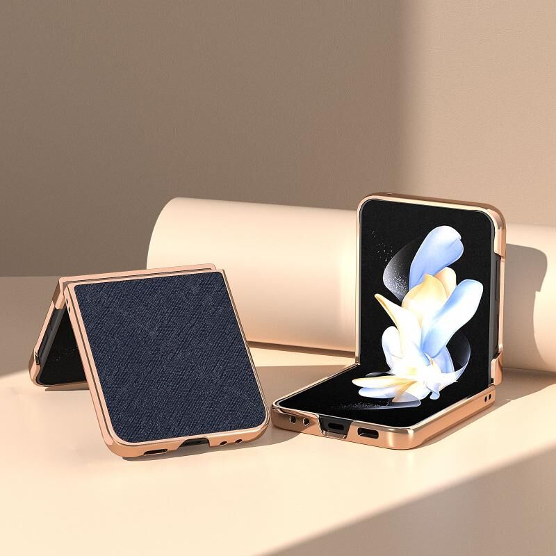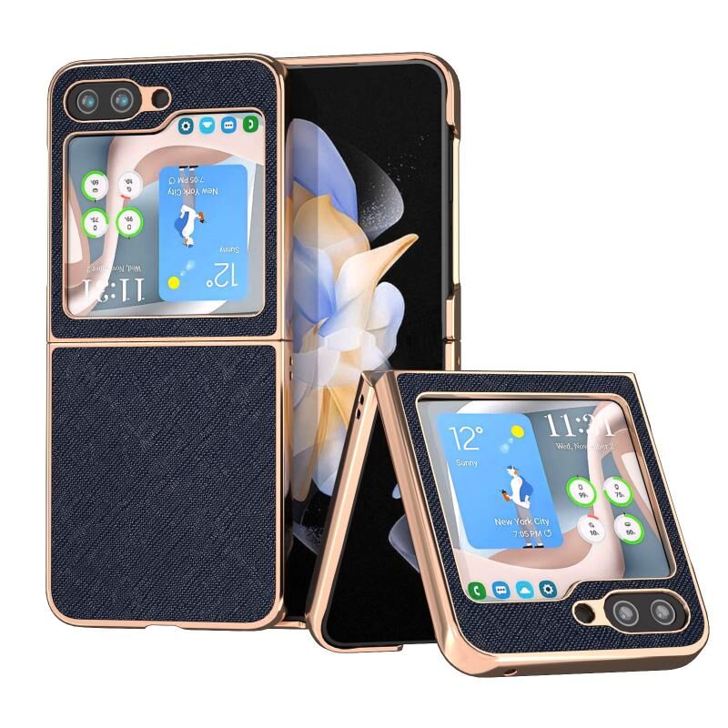 Θήκη τηλεφώνου από γνήσιο δέρμα με νανο-επίχρυση και ανάγλυφη υφή σταυρού για Samsung Galaxy Z Flip5 (Μπλε)