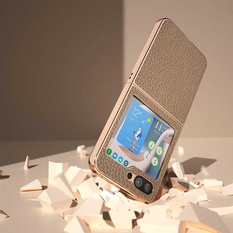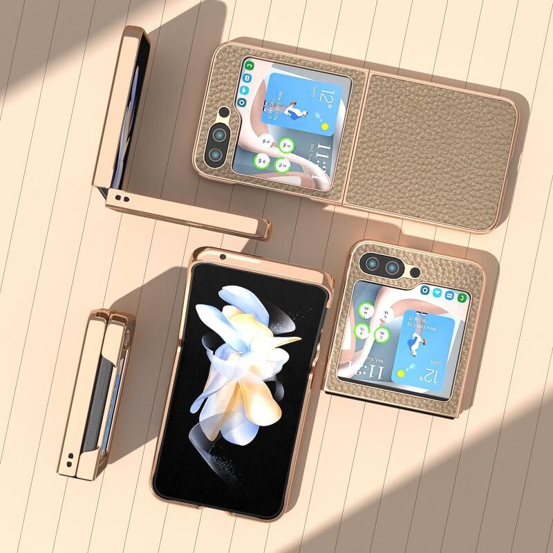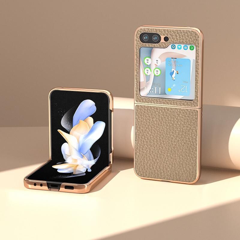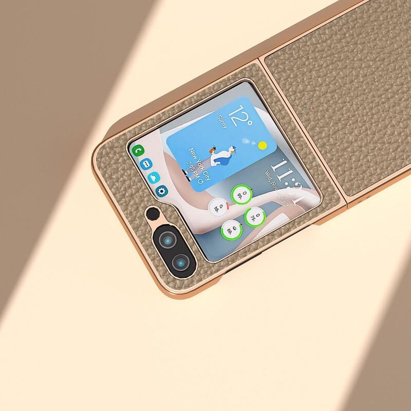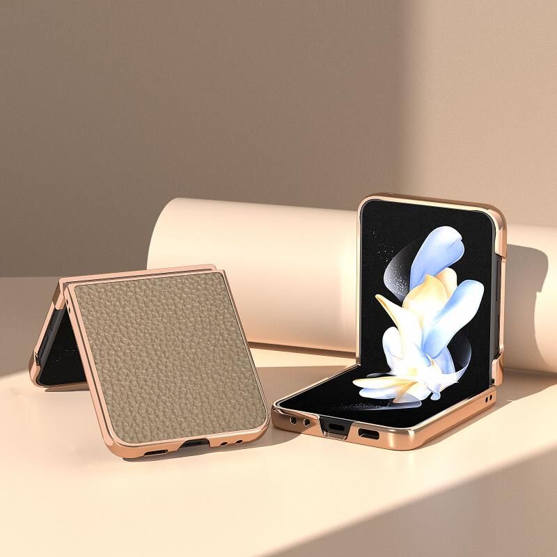 Θήκη τηλεφώνου Samsung Galaxy Z Flip5 Nano Electroplating Genuine Leather Litchi Texture (Γκρι)