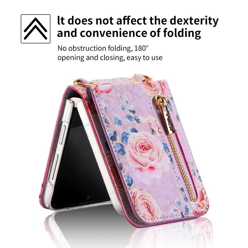 Για Samsung Galaxy Z Flip5 POLA Rose μοτίβο πολλαπλών καρτών υποδοχές φερμουάρ πορτοφόλι υπόθεση τηλεφώνου (μοβ) (POLA)