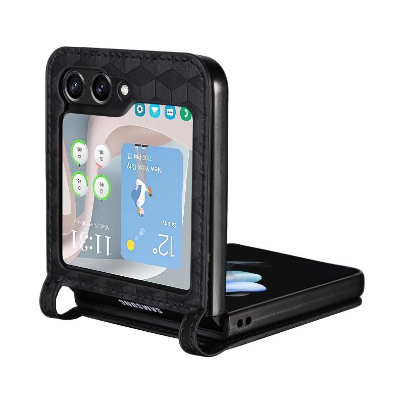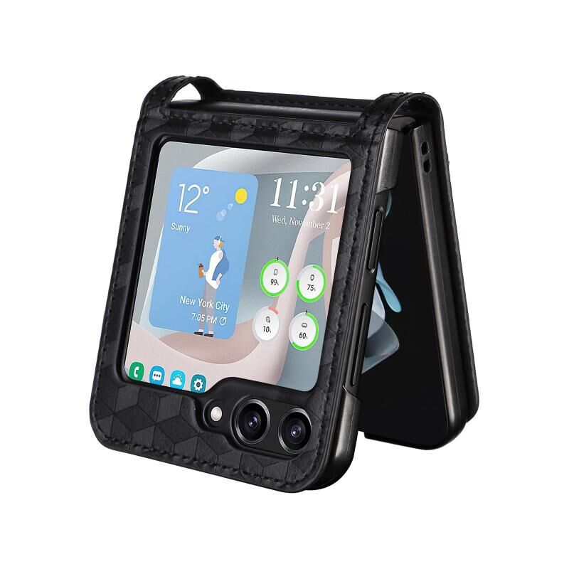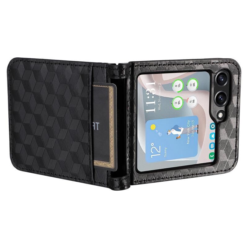 For Samsung Galaxy Z Flip5 Siamese Cubic Grid Texture Card Slot Leather Phone Case(Black)