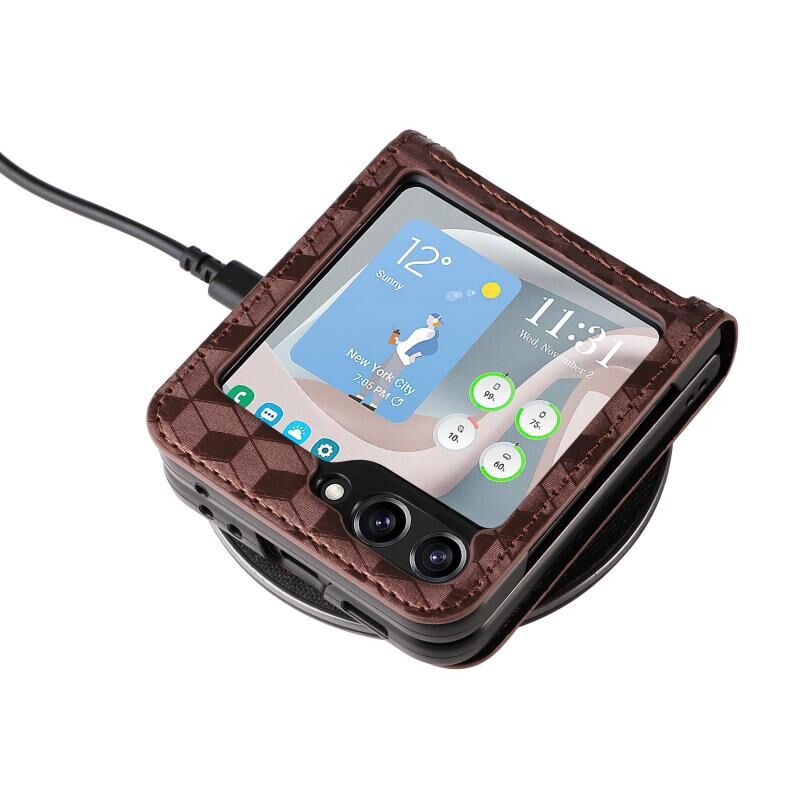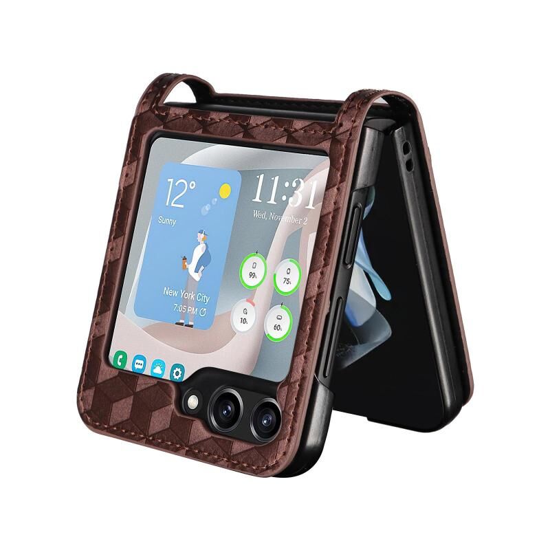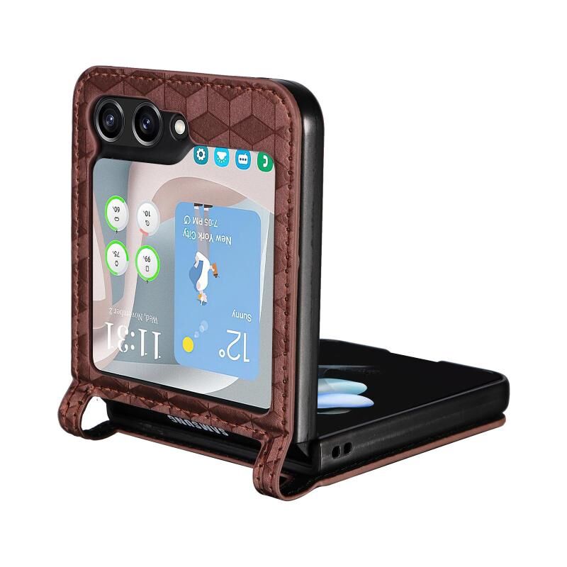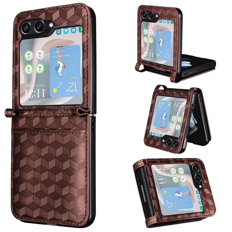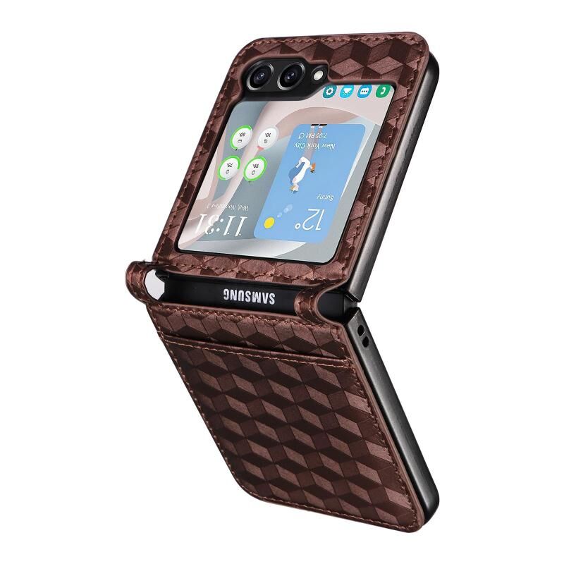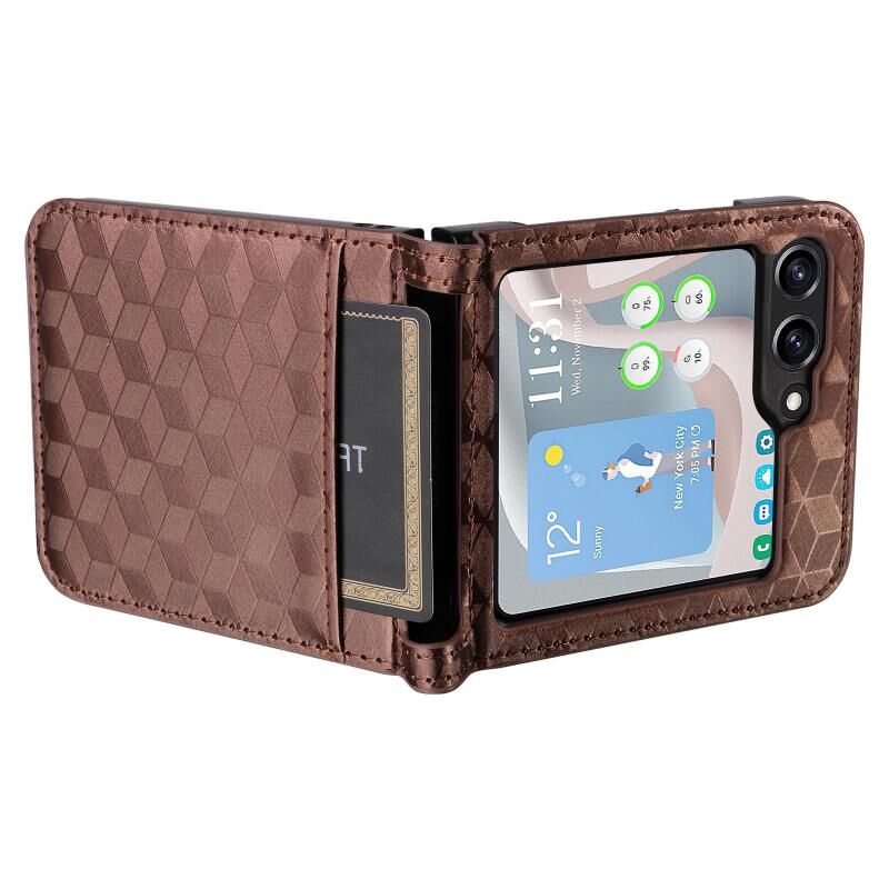 For Samsung Galaxy Z Flip5 Siamese Cubic Grid Texture Card Slot Leather Phone Case(Brown)