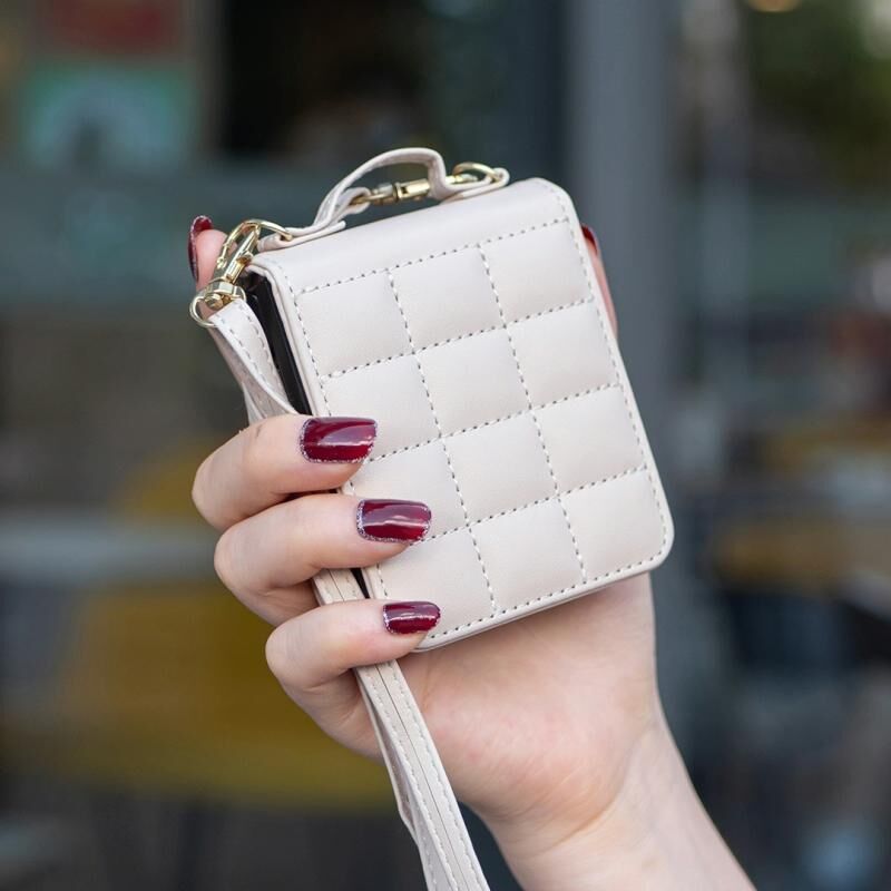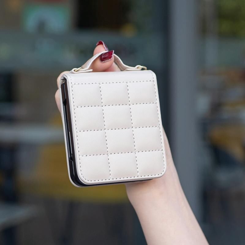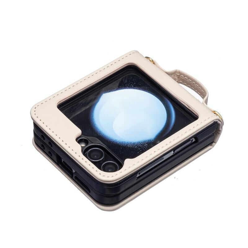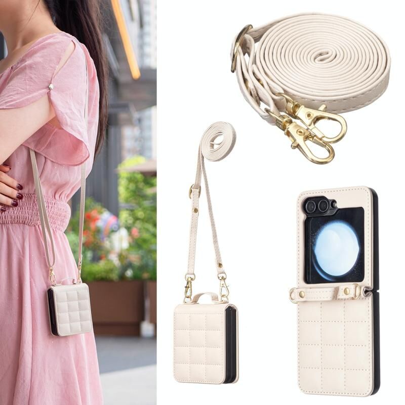 Για Samsung Galaxy Z Flip5 τετράγωνο σχήμα σταυρό κορδόνι δερμάτινη θήκη τηλεφώνου Lanyard (Μπεζ)