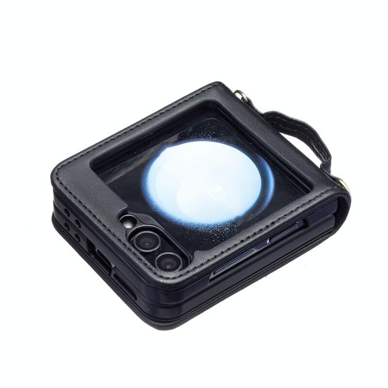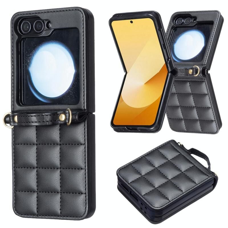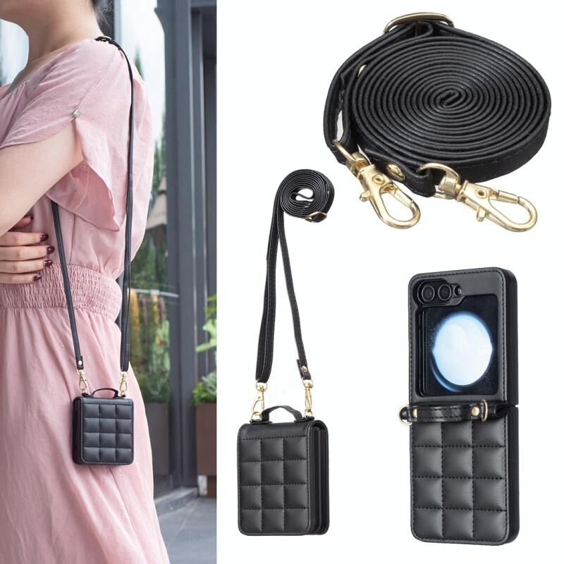 Για Samsung Galaxy Z Flip5 τετράγωνο σχήμα σταυρό κορδόνι δερμάτινη θήκη τηλεφώνου Lanyard (Μαύρο)