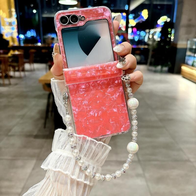 Για Samsung Galaxy Z Flip5 τρία μέρη Pearlescent Shell Υφή τηλέφωνο υπόθεση με βραχιόλι (κόκκινο)