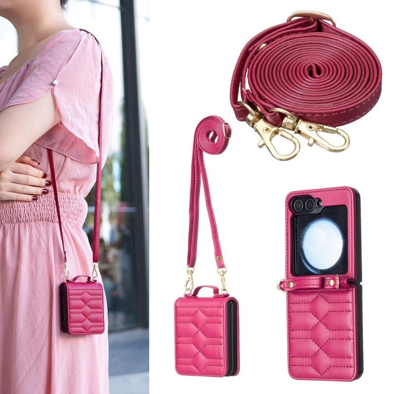 Για Samsung Galaxy Z Flip5 V-σχήμα Crossbody Lanyard δέρμα τηλέφωνο υπόθεση (Rose Red)