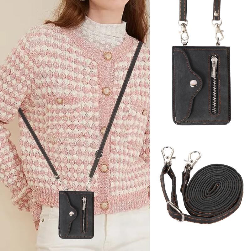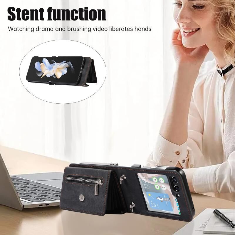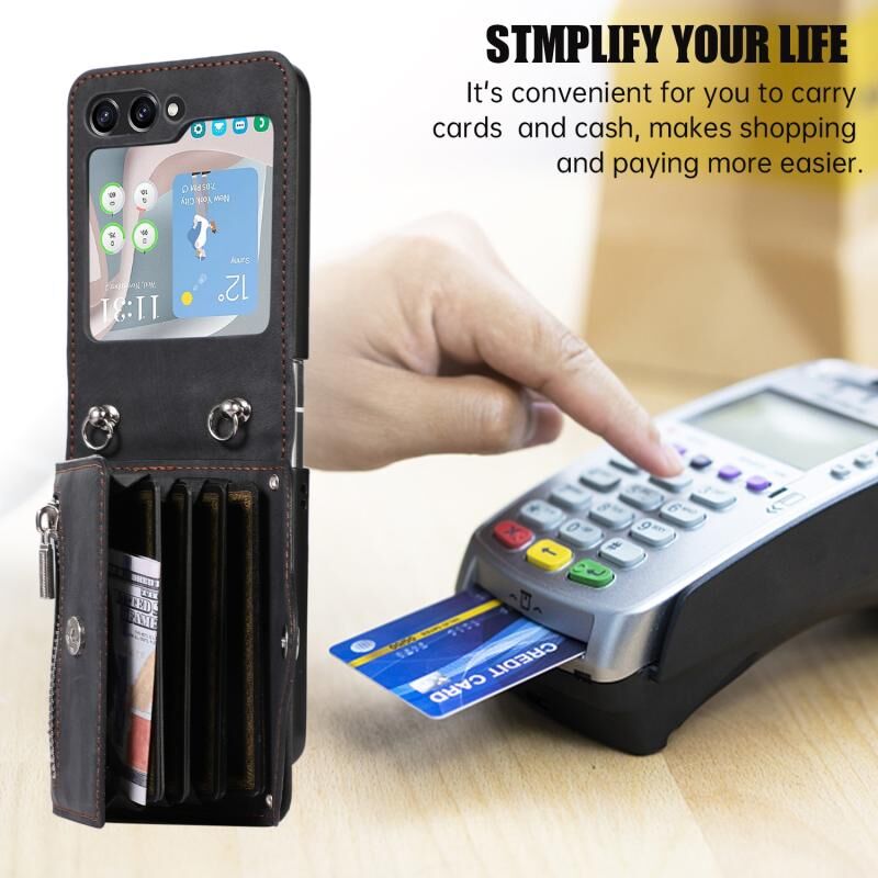 Θήκη κινητού τηλεφώνου Samsung Galaxy Z Flip5 με φερμουάρ, θήκες καρτών RFID και λουρί (Μαύρο)
