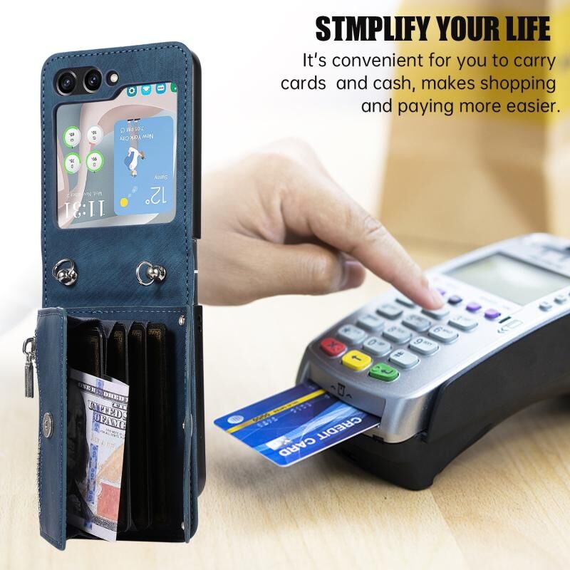 Θήκη κινητού τηλεφώνου Samsung Galaxy Z Flip5 με φερμουάρ, θήκες καρτών RFID και λουρί (Μαύρο)