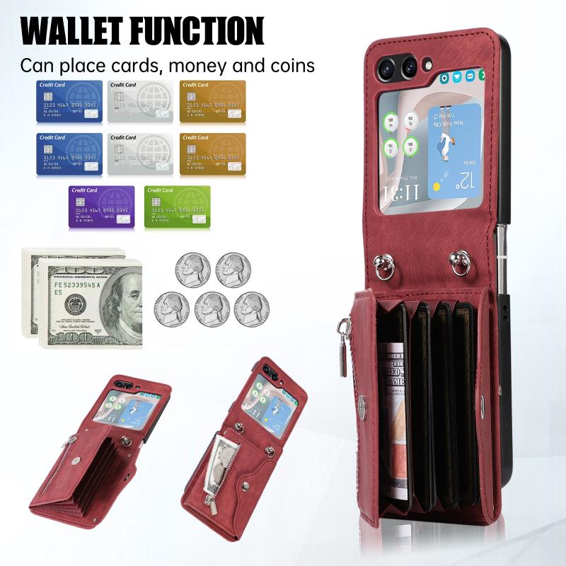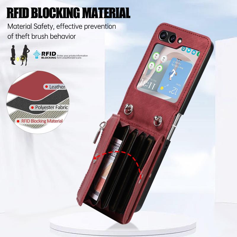 Θήκη κινητού τηλεφώνου Samsung Galaxy Z Flip5 με φερμουάρ, θήκες καρτών RFID και λουρί (Μαύρο)