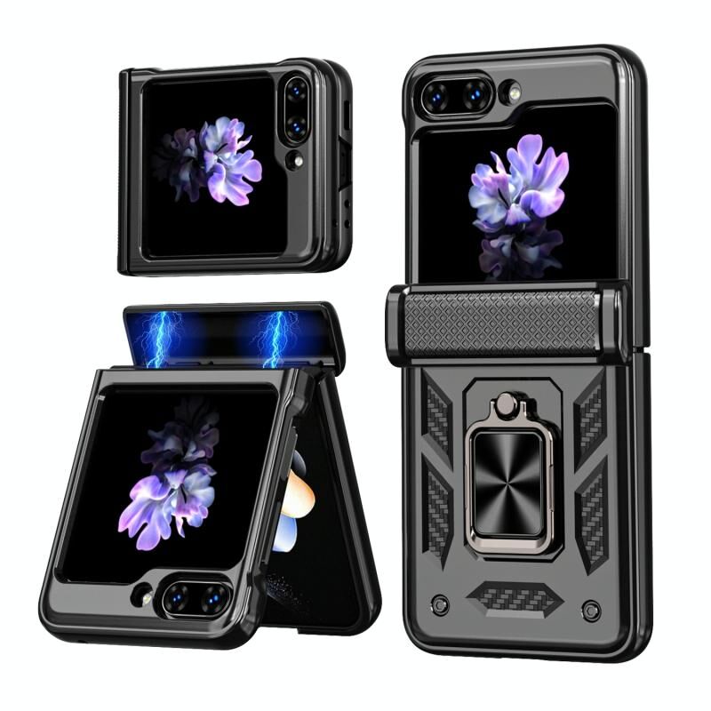 Για Samsung Galaxy Z Flip6 5G συρόμενο παράθυρο με μεντεσέ τηλέφωνο υπόθεση με δαχτυλίδι Stand (Μαύρο)