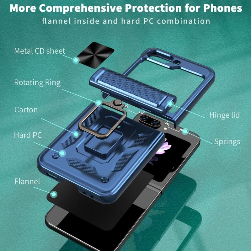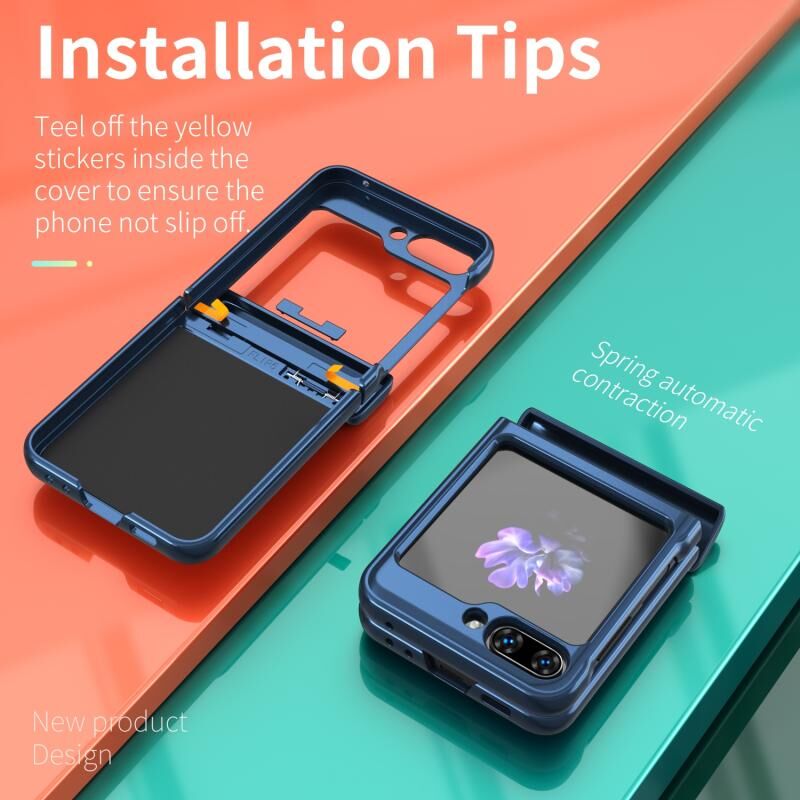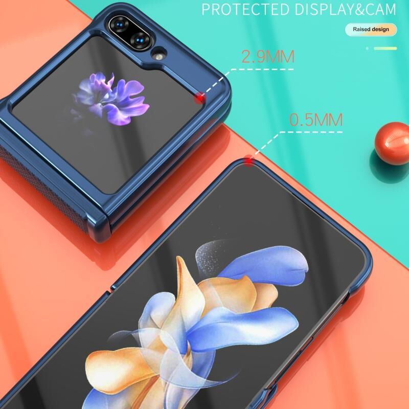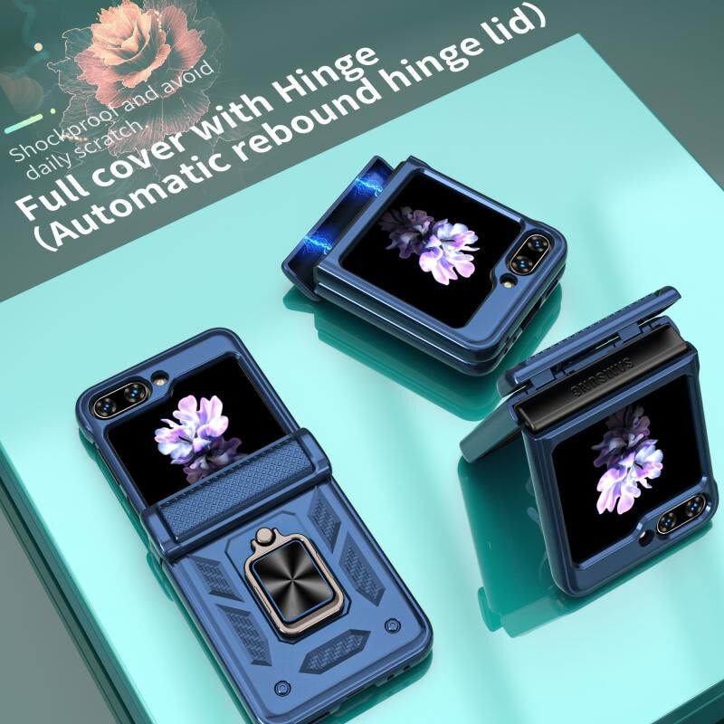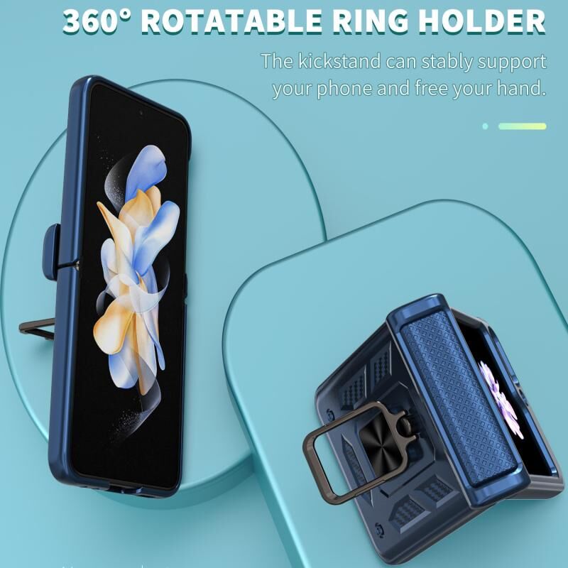 Για Samsung Galaxy Z Flip6 5G συρόμενο παράθυρο με μεντεσέ τηλέφωνο υπόθεση με δαχτυλίδι Stand (μπλε)