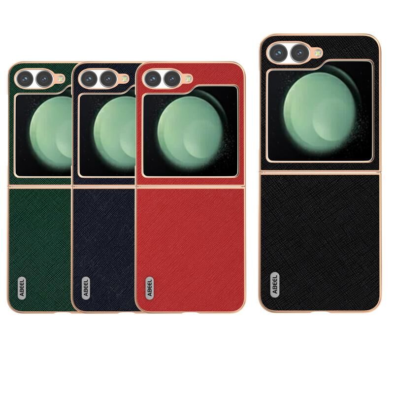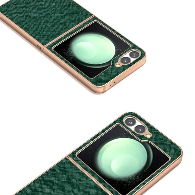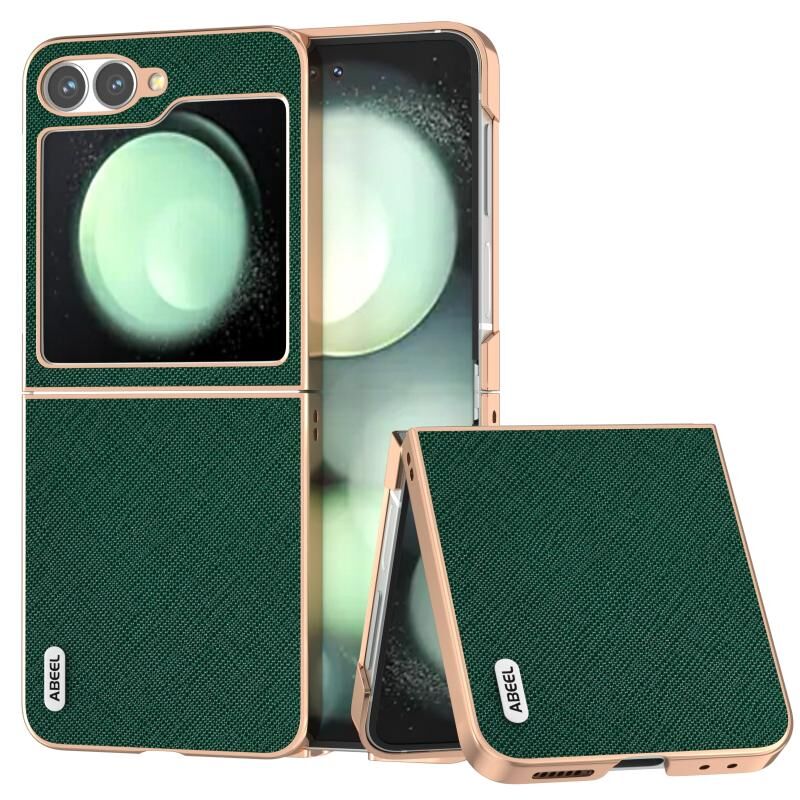 For Samsung Galaxy Z Flip6 ABEEL Electroplating Frame Cross Texture Genuine Leather Phone Case(Green)