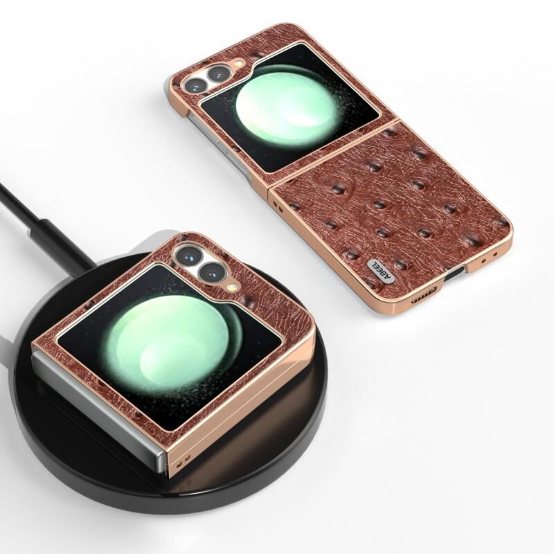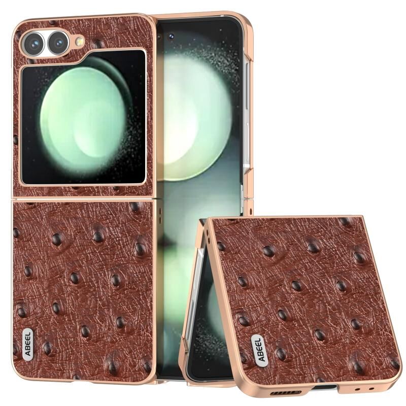 For Samsung Galaxy Z Flip6 ABEEL Electroplating Frame Genuine Leather Ostrich Texture Phone Case(Coffee)