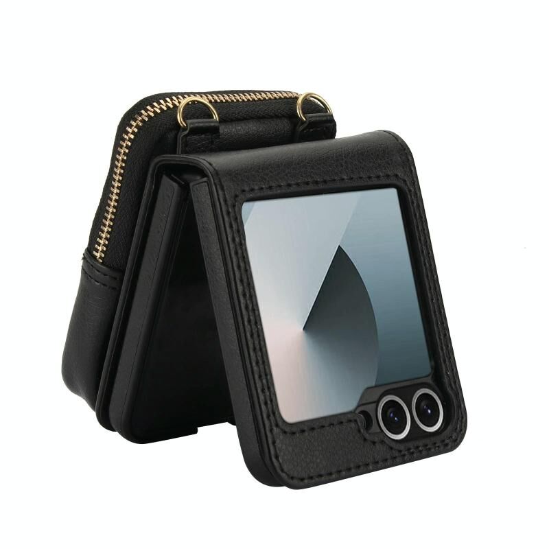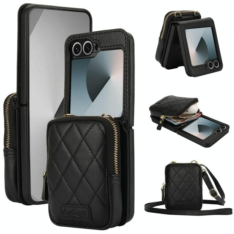 Θήκη κινητού τηλεφώνου AwQuer για Samsung Galaxy Z Flip6, τσάντα crossbody με φερμουάρ και πορτοφόλι από δέρμα λύτσι (Μαύρο) (Awquer)