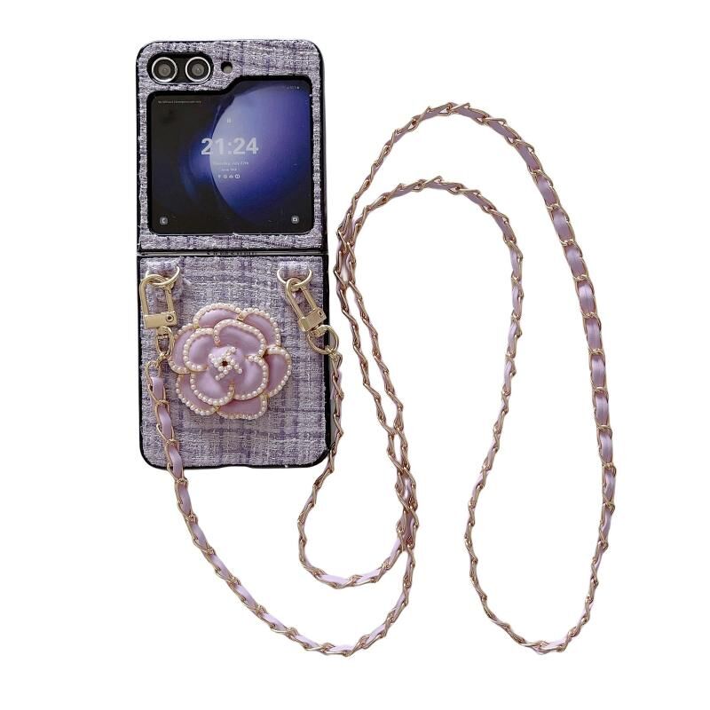 Για Samsung Galaxy Z Flip6 Camellia καρό ύφασμα PC υπόθεση τηλεφώνου με μακρύ κορδόνι (μωβ)