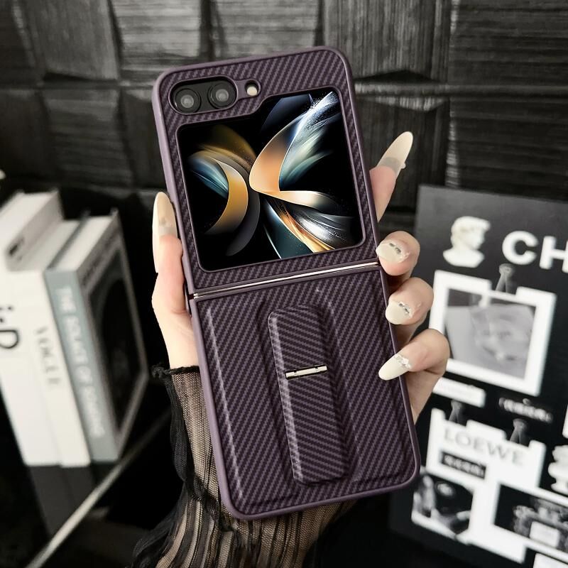 Για Samsung Galaxy Z Flip6 Carbon Fiber Πτυσσόμενη δερμάτινη θήκη τηλεφώνου με βάση (μωβ)