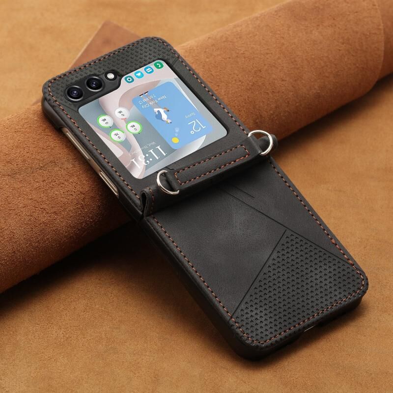 Για το Samsung Galaxy Z Flip6 Dream Triangle Πτυσσόμενη δερμάτινη θήκη τηλεφώνου με κορδόνι (Μαύρο)