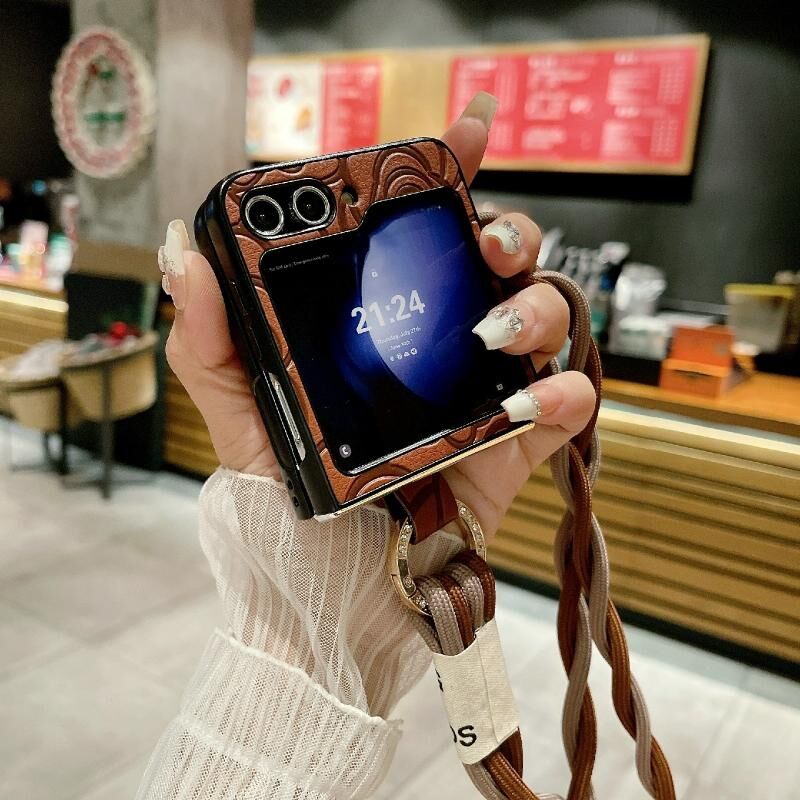 Για Samsung Galaxy Z Flip6 Εντύπωση Camellia μοτίβο Προστατευτική θήκη τηλεφώνου με Diamond Ring Long Lanyard (καφέ)