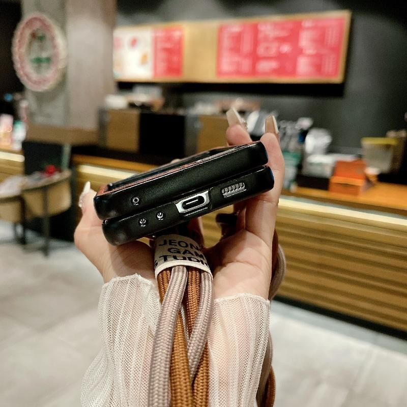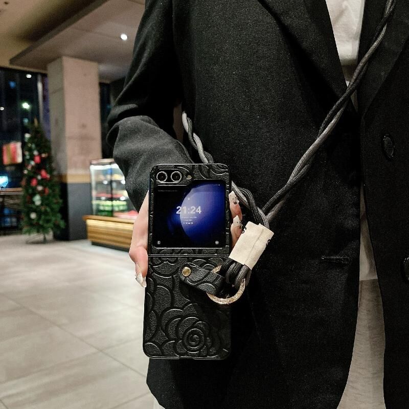 Για Samsung Galaxy Z Flip6 Εντύπωση Camellia μοτίβο Προστατευτική θήκη τηλεφώνου με Diamond Ring Long Lanyard (κόκκινο)