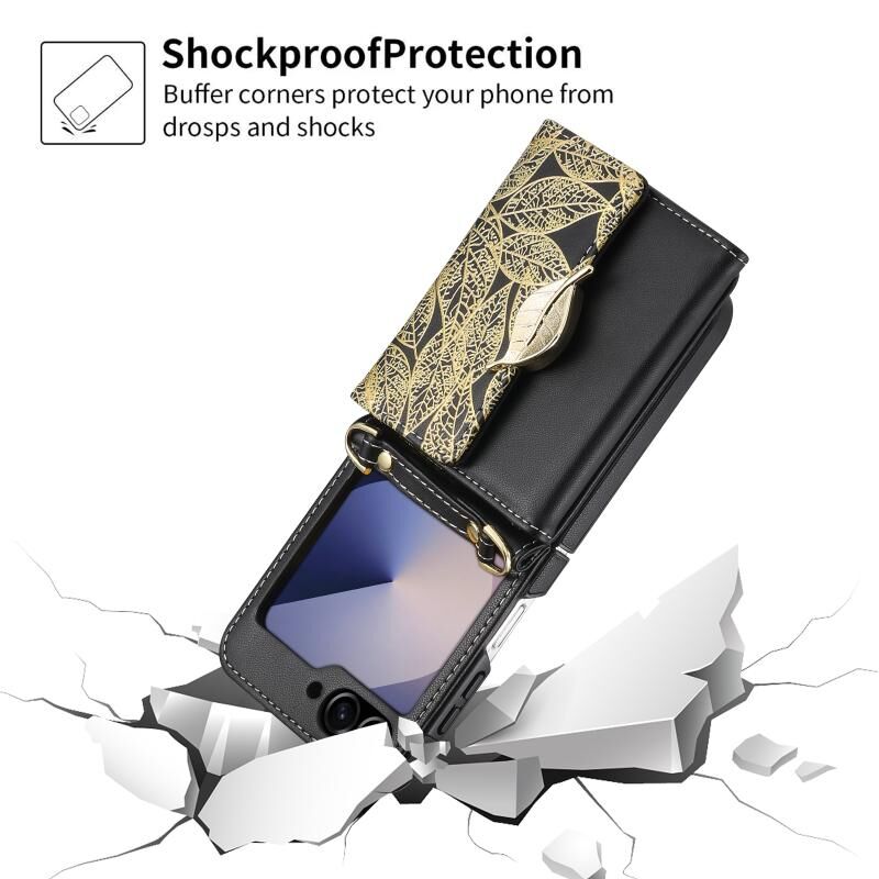 Για Samsung Galaxy Z Flip6 POLA Multi-Card Slots φύλλο μοτίβο υπόθεση τηλεφώνου (μαύρο) (POLA)