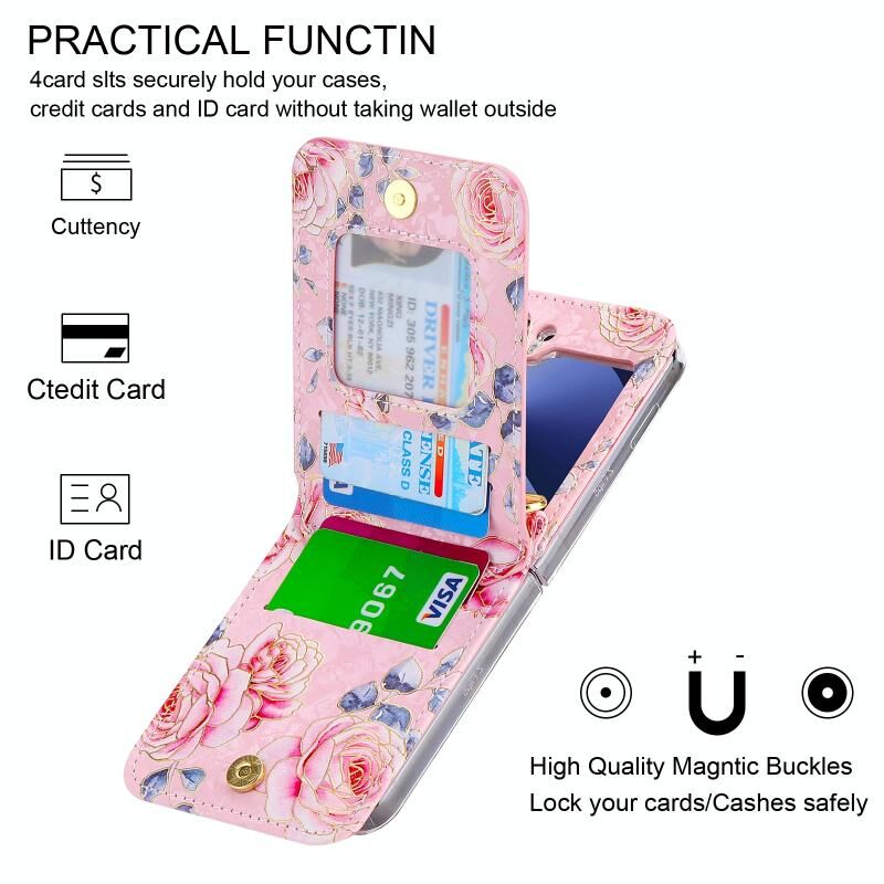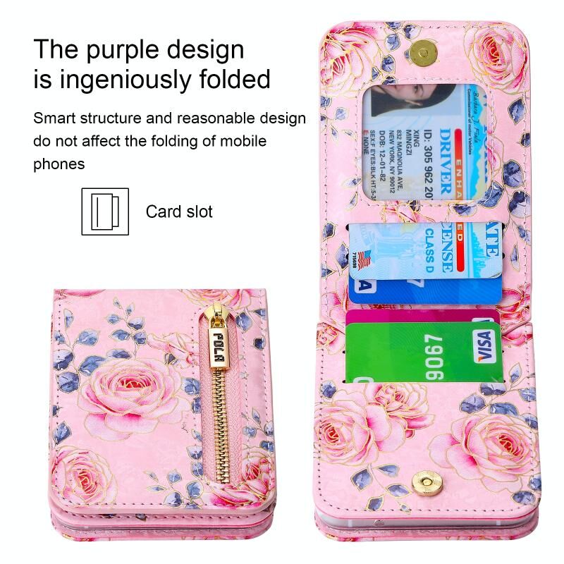 Για Samsung Galaxy Z Flip6 POLA Rose μοτίβο πολλαπλών καρτών υποδοχές φερμουάρ πορτοφόλι υπόθεση τηλεφώνου (ροζ) (POLA)