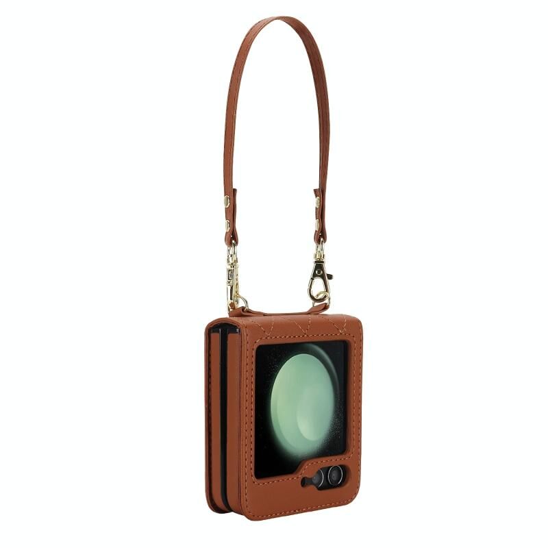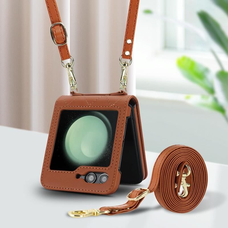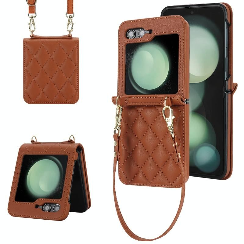 Για Samsung Galaxy Z Flip6 Rhombic Υφή θήκη τηλεφώνου με μακρύ & κοντό κορδόνι (καφέ)