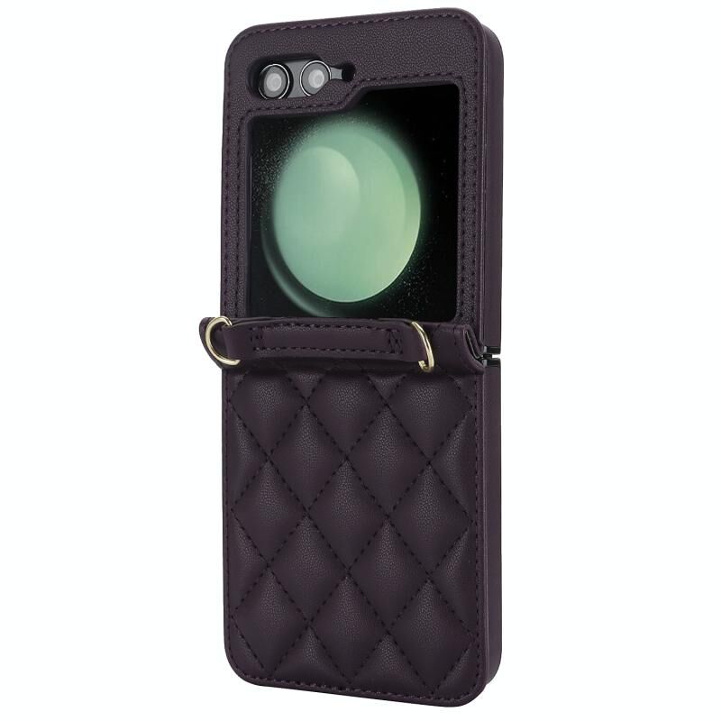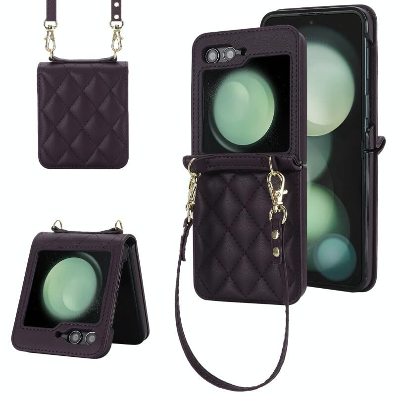 Για Samsung Galaxy Z Flip6 Rhombic Υφή θήκη τηλεφώνου με μακρύ & κοντό κορδόνι (σκούρο μωβ)