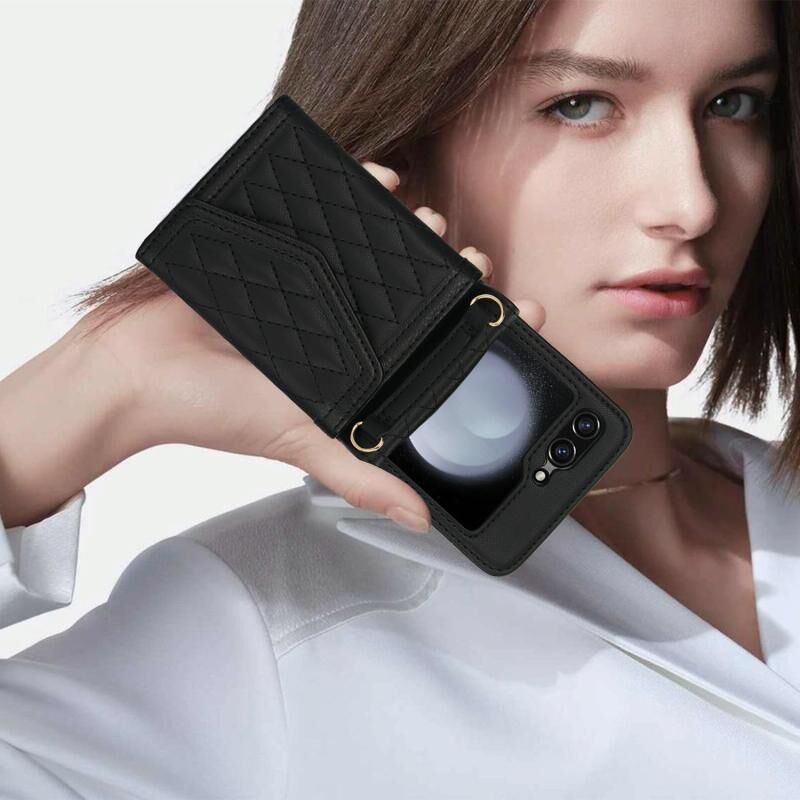 Για Samsung Galaxy Z Flip6 Splicing Rhombic Υφή τηλέφωνο υπόθεση με μακρύ & σύντομο κορδόνι, δεν περιλαμβάνεται στυλό (Μαύρο)