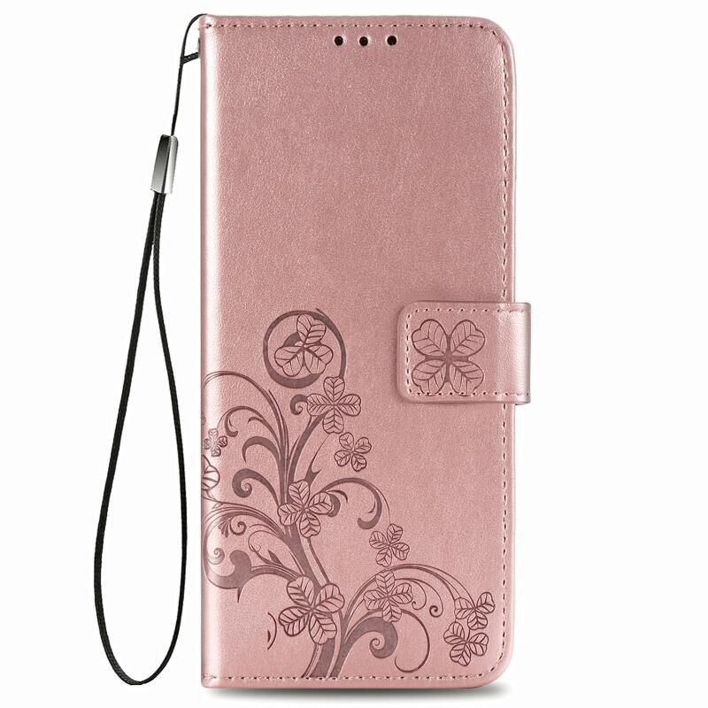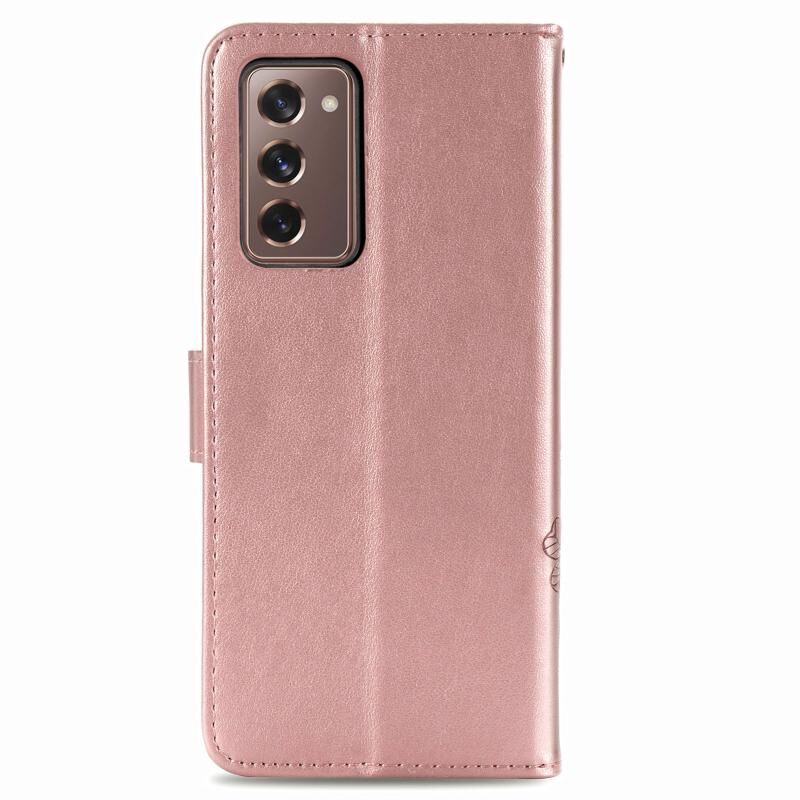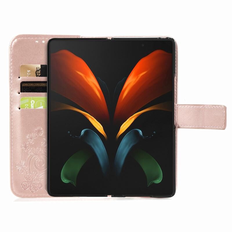 Θήκη δερμάτινη προστασίας κινητού τηλεφώνου για Samsung Galaxy Z Fold2 με κουμπωτό κούμπωμα σε σχήμα τριφυλλιού, λουράκι, θήκη για κάρτες, πορτοφόλι και λειτουργία βάσης (Χρυσορόδινο).