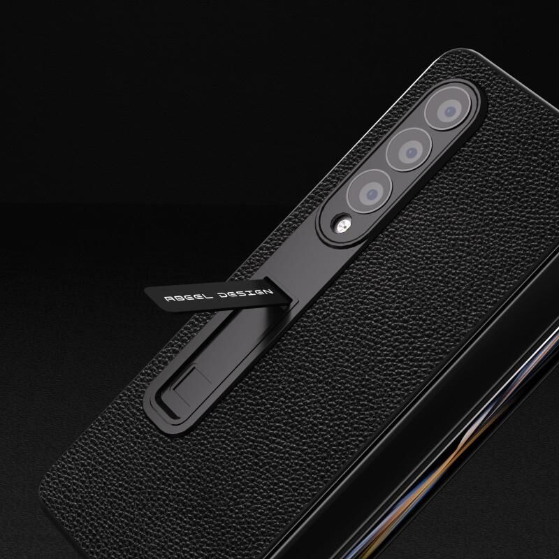 Θήκη τηλεφώνου Mino από γνήσιο δέρμα με ενσωματωμένη βάση για Samsung Galaxy Z Fold3 5G, Μαύρο, με πράσινη λεπτομέρεια.