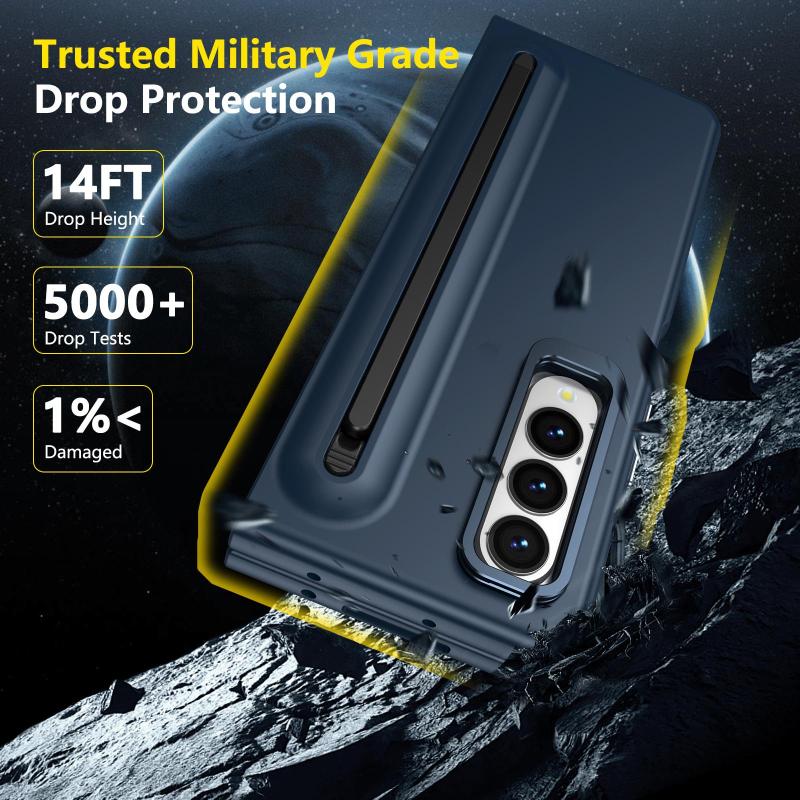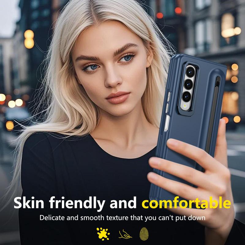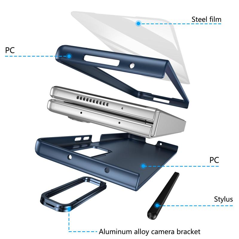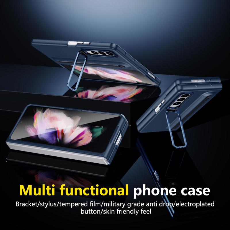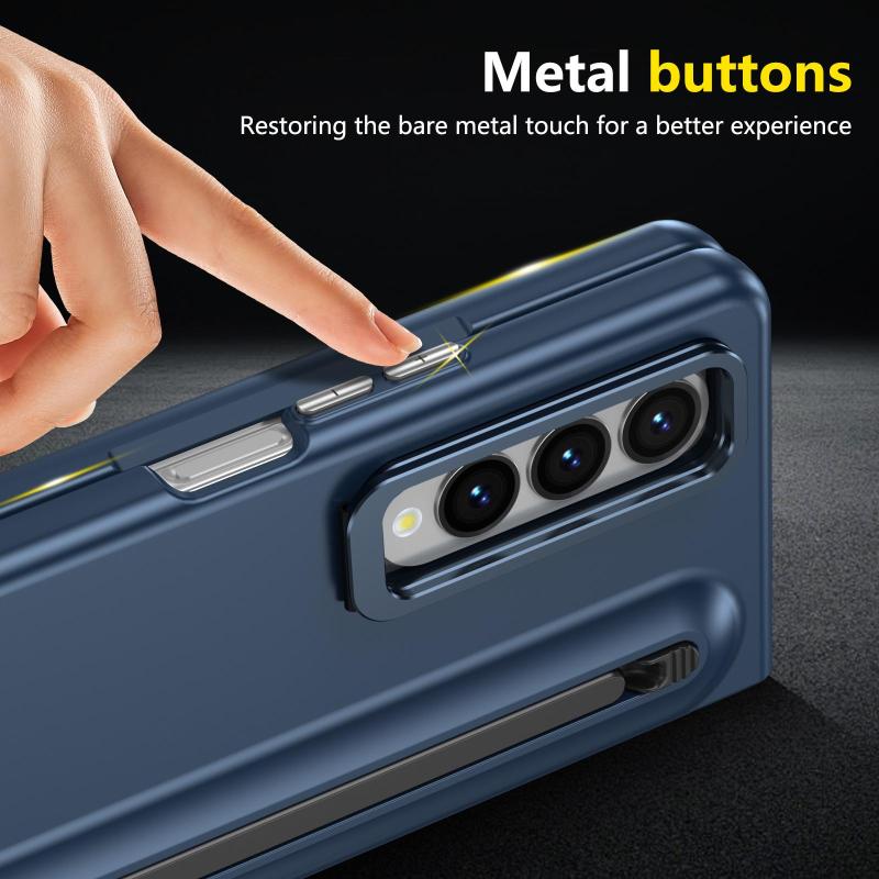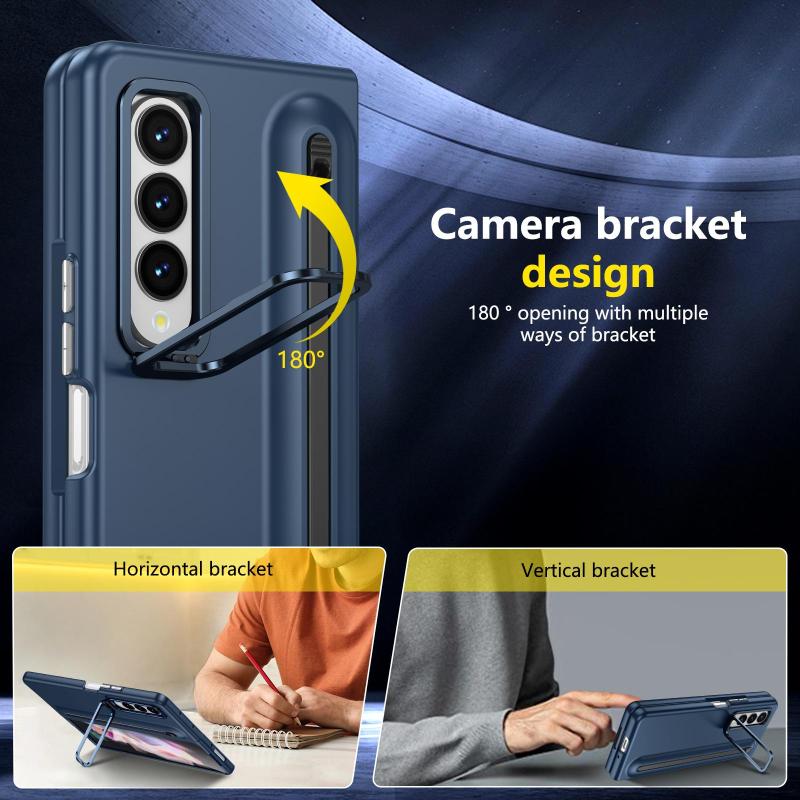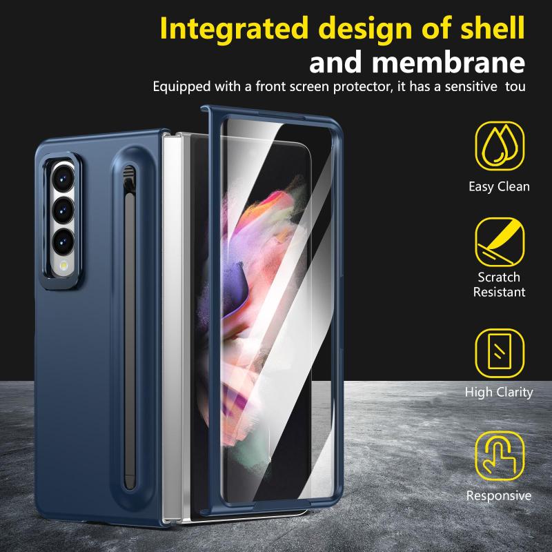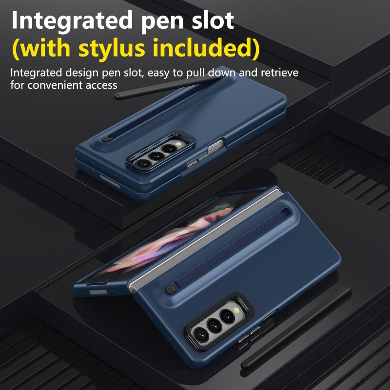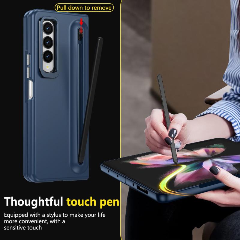 For Samsung Galaxy Z Fold3 5G Integrated Skin Feel Lens Folding Holder Pen Slot Shockproof Phone Case with Pen(Dark Blue)