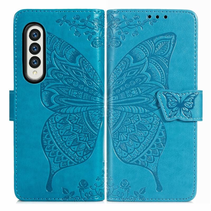 Για Samsung Galaxy Z Fold3 πεταλούδα αγάπη λουλούδια ανάγλυφο οριζόντια Flip δερμάτινη θήκη με κάτοχο & υποδοχές για κάρτες & πορτοφόλι & κορδόνι (μπλε)
