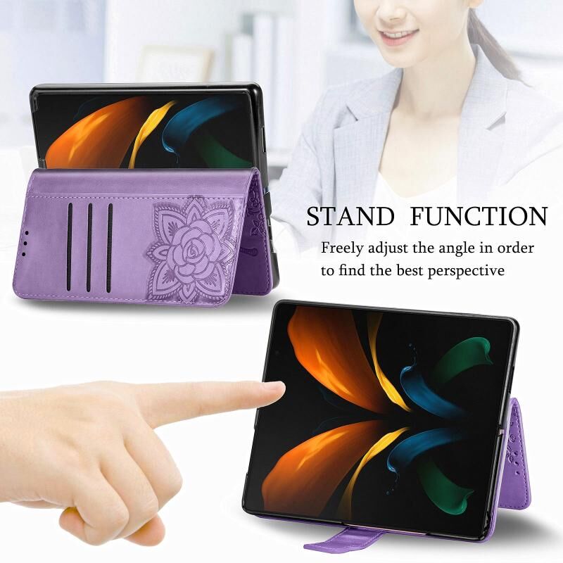 Για Samsung Galaxy Z Fold3 πεταλούδα αγάπη λουλούδια ανάγλυφο οριζόντια Flip δερμάτινη θήκη με κάτοχο & υποδοχές για κάρτες & πορτοφόλι & κορδόνι (ανοιχτό μοβ)