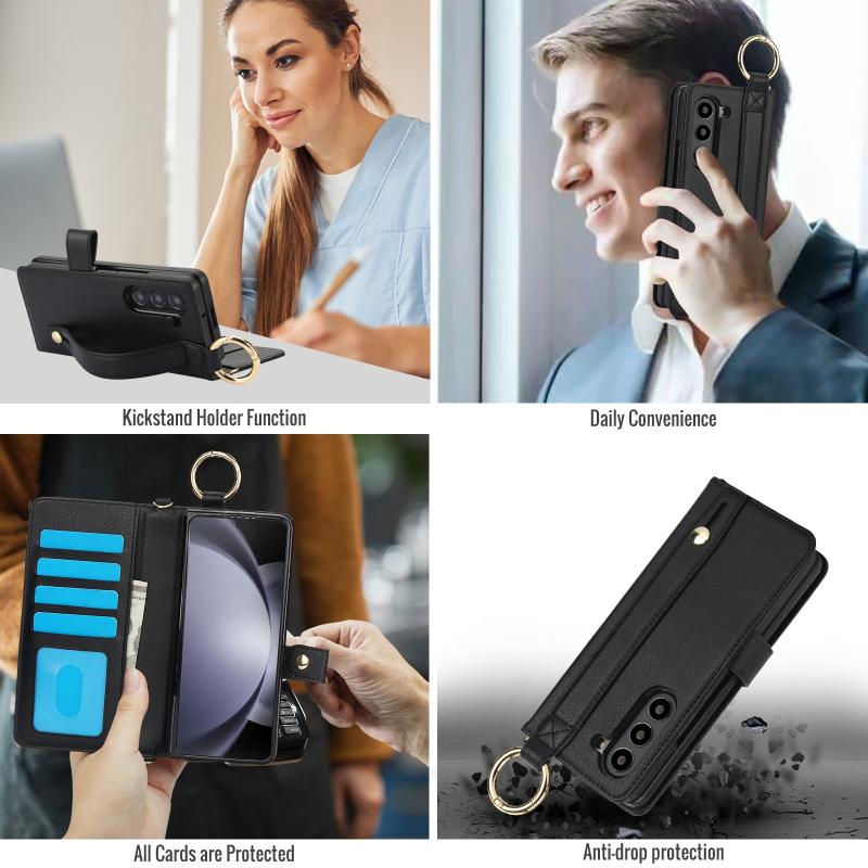 For Samsung Galaxy Z Fold3 Solid Color Wristband Ring RFID Leather Phone Case with Lanyard(Black)