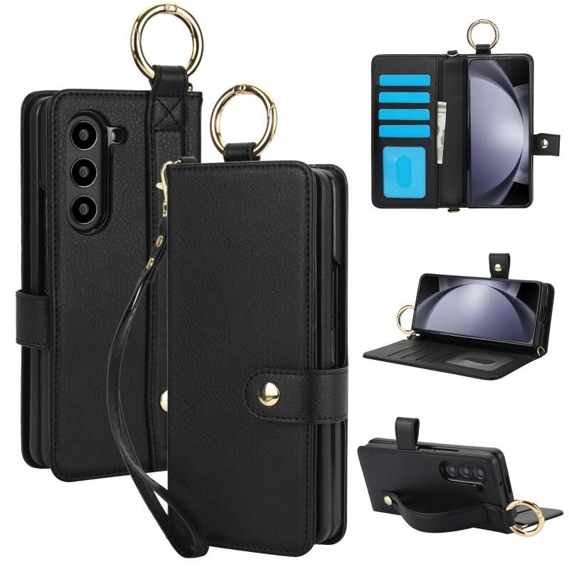 Θήκη τηλεφώνου Samsung Galaxy Z Fold3 από δέρμα με RFID, με λουρί καρπού και δακτύλιο σε συμπαγές χρώμα (Μαύρο)
