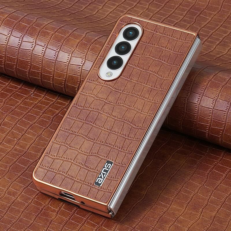 For Samsung Galaxy Z Fold4 5G AZNS Electroplated Frame Crocodile Texture Full Coverage Phone Case(Brown) (AZNS)